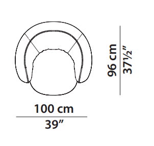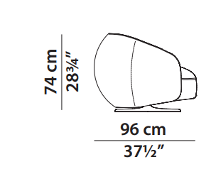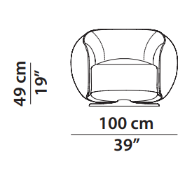 MDF plywood frame. Differentiated density polyurethane foam filling with acrylic fibre cover. Springing with woven elastic straps of covered rubber. Black-stained underbody base. Armchair with hand-finished burnished metal revolving base.