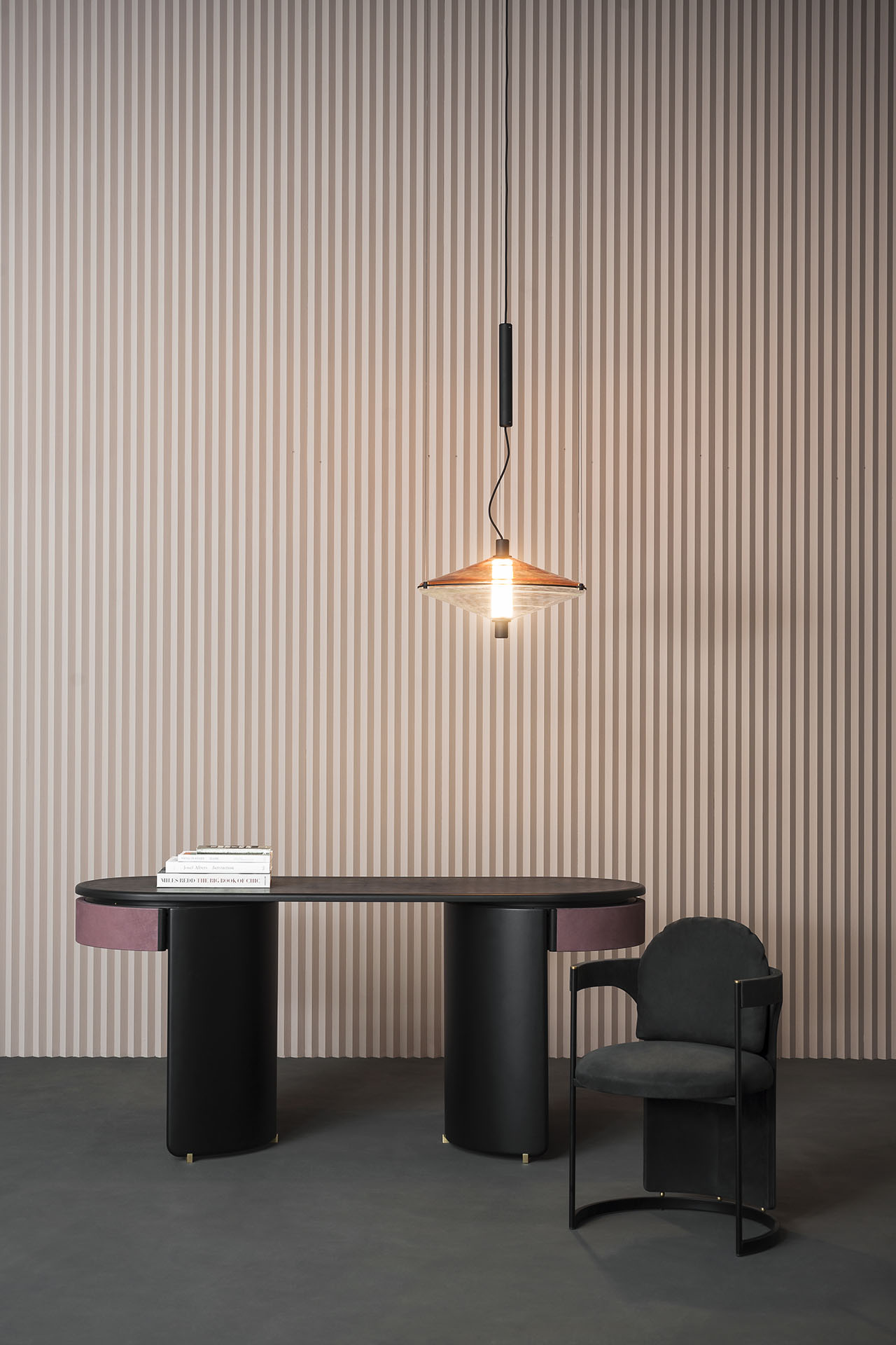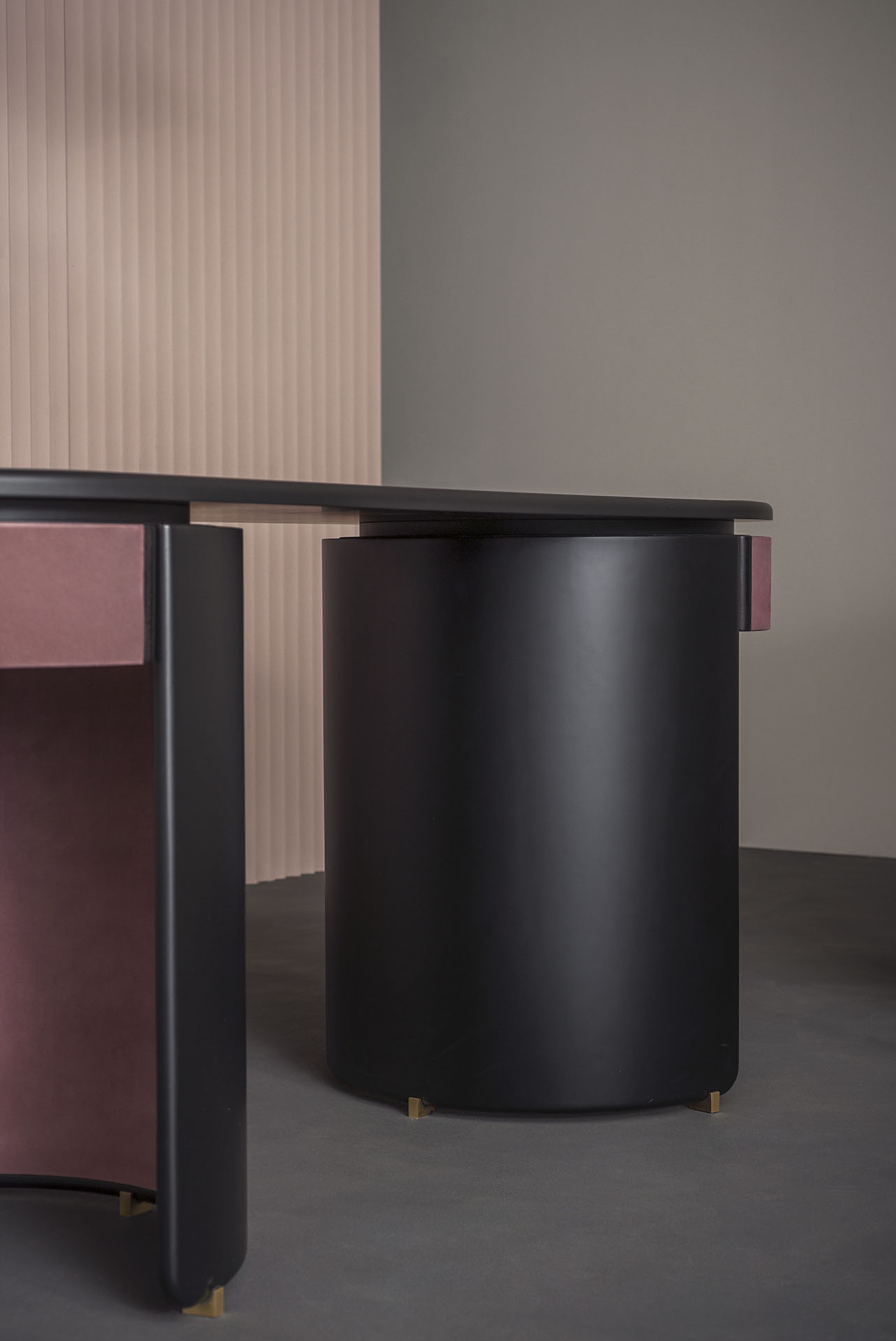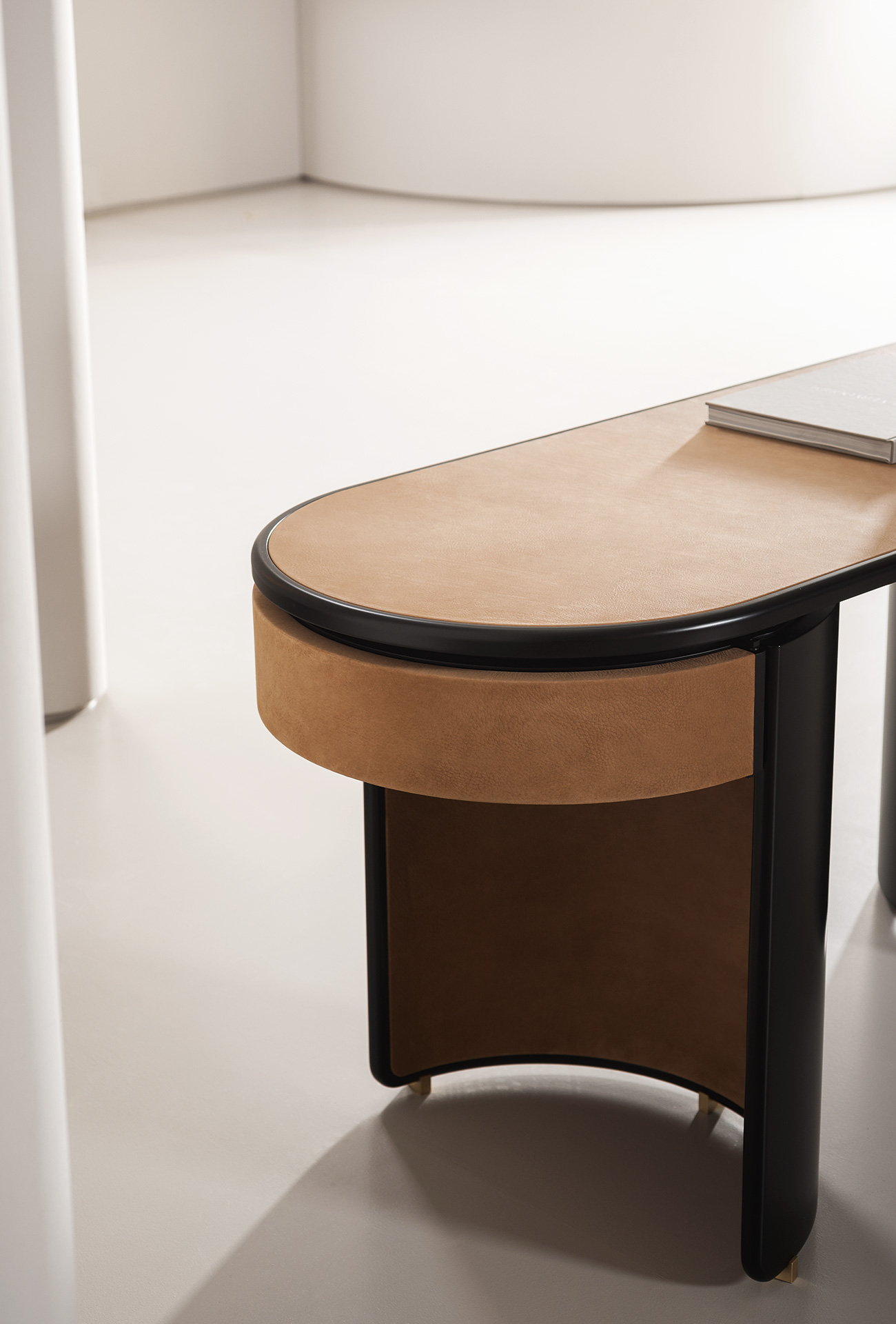 Matte black-lacquered MDF top with leather-covered central part. Legs in poplar plywood, externally matte black-lacquered, with leather-covered inside.