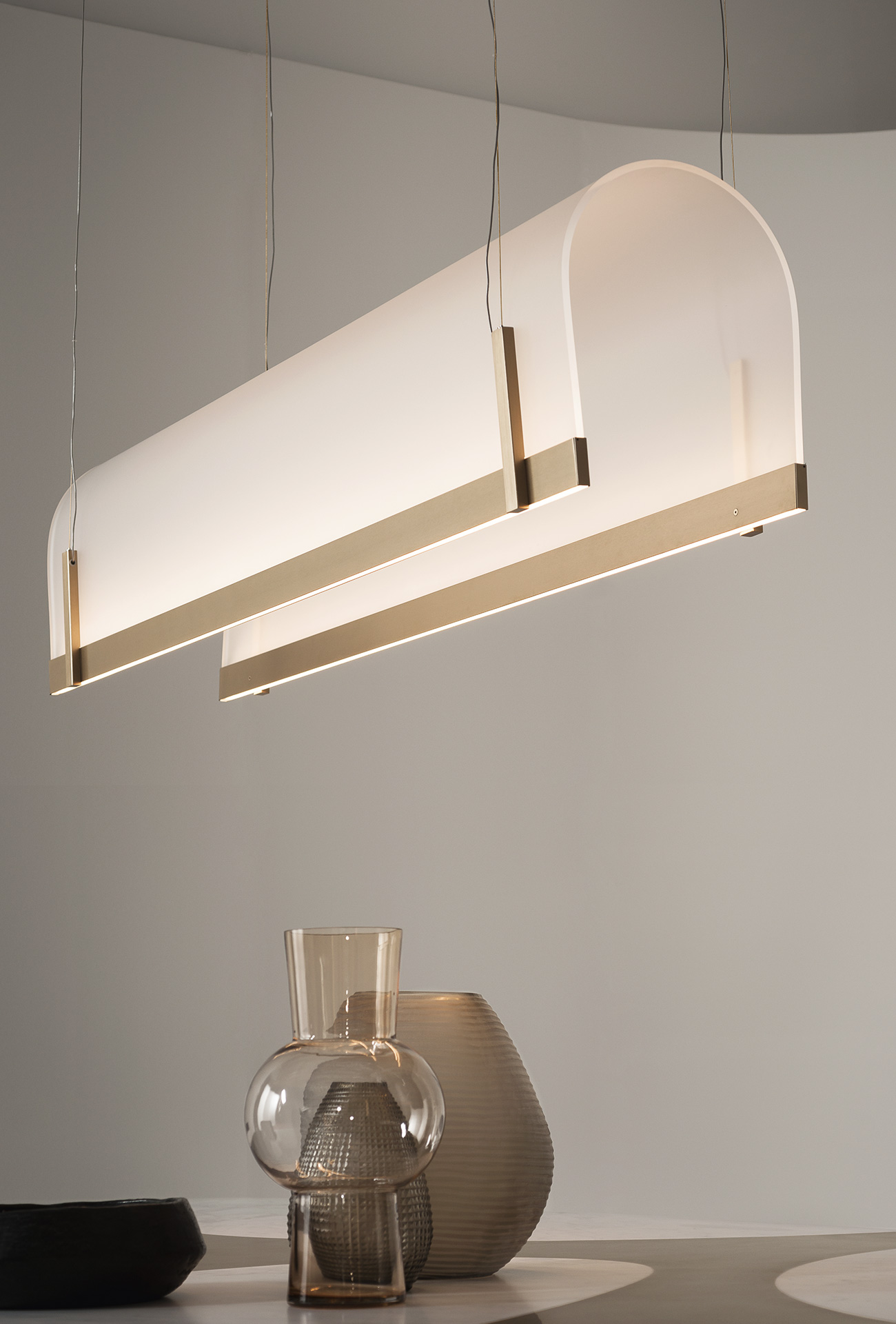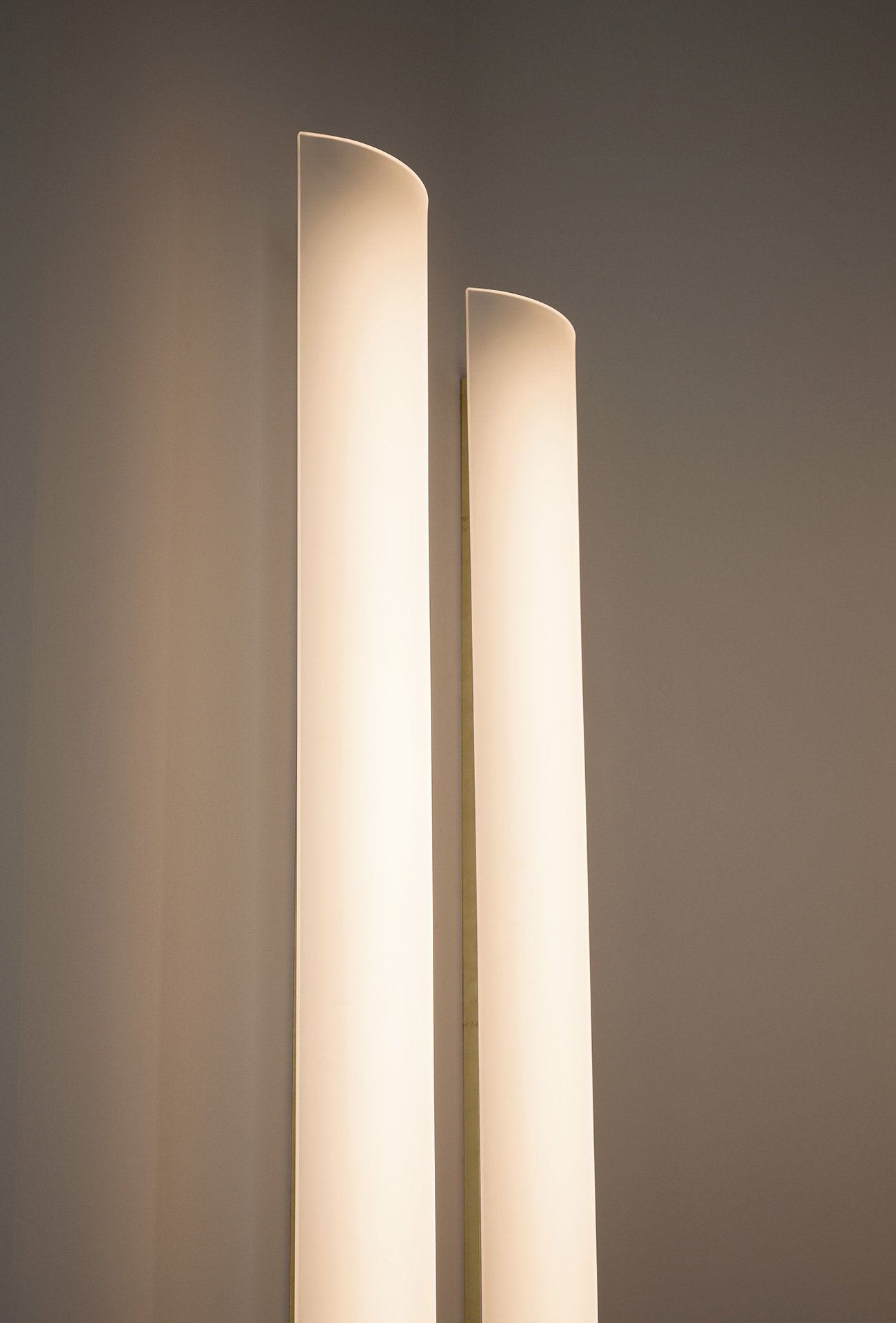 8 mm thick lampshade in printed curved methacrylate. Profiles and details in satin brass-coated metal with matte varnish. Lamp with 2700K led light source.