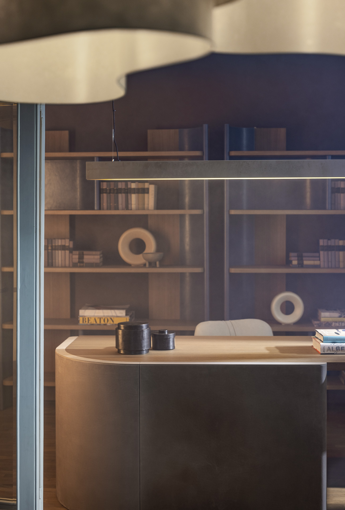 The collection designed by Christophe Delcourt for Baxter is a perfect synthesis of nostalgia and futurism. The writing table, an element that more than any other informs us how a room will be used, abandons its managerial rigour: the chest of drawers slotted under the large work table is covered by one of the support bases, which follows its profile half-way along, creating a harmony of solids and voids. For the bookcase, freestanding or wall-mounted, the concept of verticality meets the idea of the curve. Modular, it plays with the dualism between symmetry and asymmetry and offers a relaxing, undulating movement that is easy on the eye. The low cabinet has an elegant profile and its generous volume, punctuated by a concept of doors with a three-dimensional effect, reframes the perspective of the room.