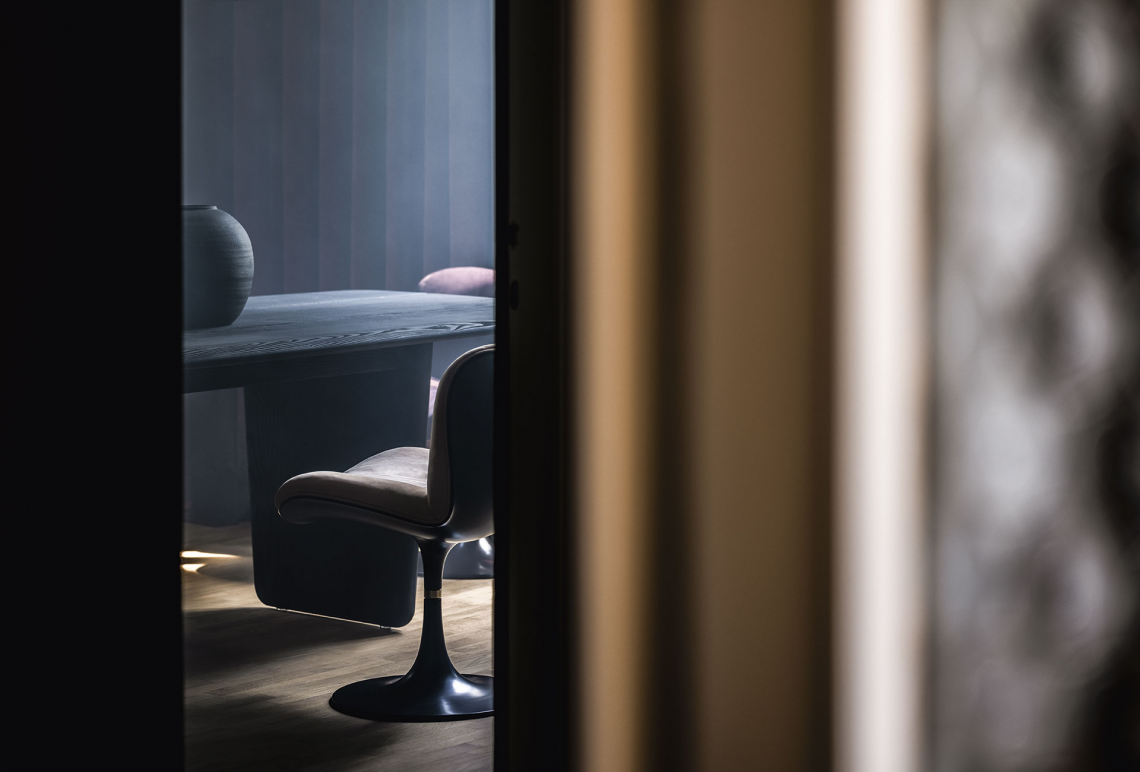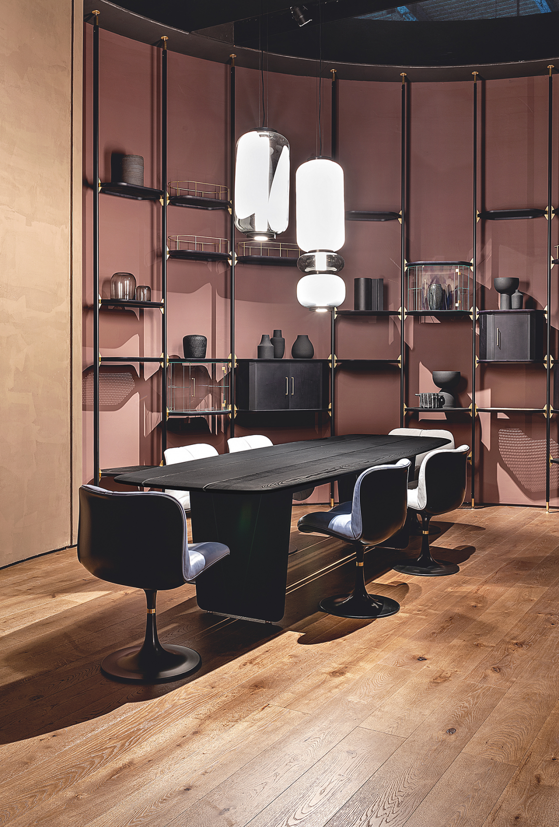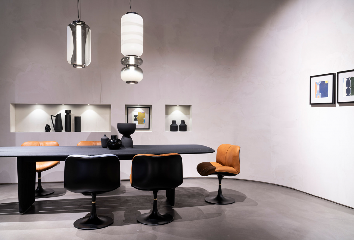 Crossing the threshold into the dining or study area, however, those same characteristics interpreted in the version featuring sandblasted solid ash that has been stained black take on a more solid personality. It is the versatility with which Nairobi succeeds in giving substance to the idea of the world we have built up through travelling and living, the synthesis of the freest experiences and those regulated by the rules of coexistence; it indicates a more relaxed way of welcoming, a conversation without labels.