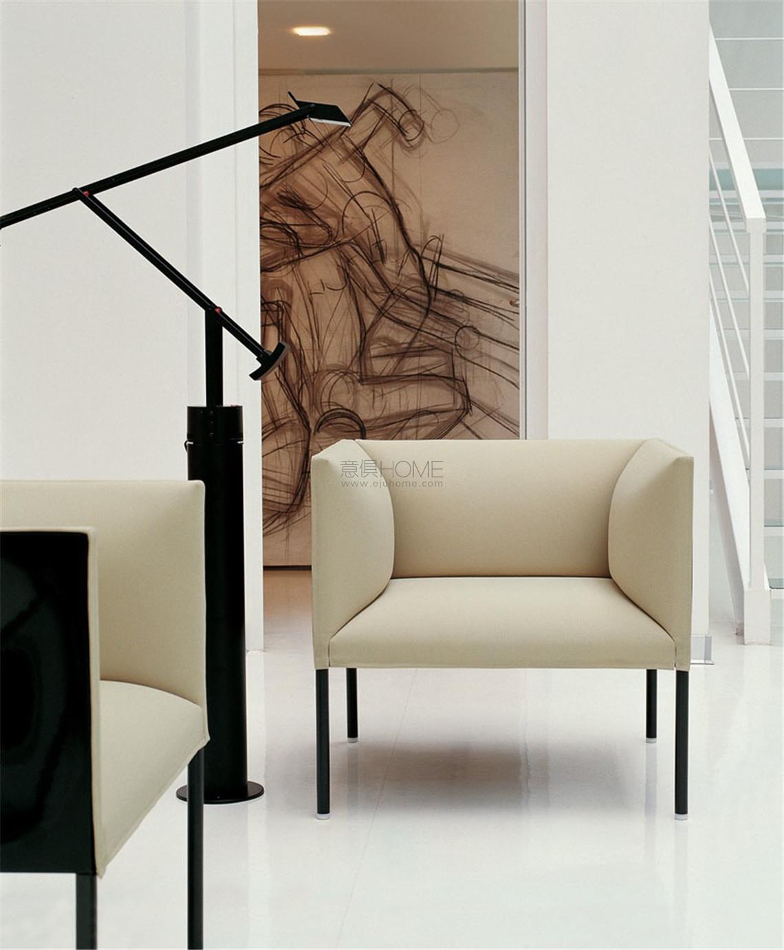 這個項目是由一組大小不一、模塊化的面板打造而成。它們能夠通過鉸鏈組裝起來,成為靠背和扶手并支撐柔軟的座椅。整個有填充且?guī)в袃?nèi)襯的面板在外部呈現(xiàn)出一種凹陷的塑料表面,這讓各種元素在視覺上都消失了,更加凸顯了其輕盈的效果。源自這個系統(tǒng)的各種類型包括一把扶手椅和一個有兩種尺寸的小型雙人沙發(fā),以及一個有兩種尺寸的小型三人沙發(fā)。