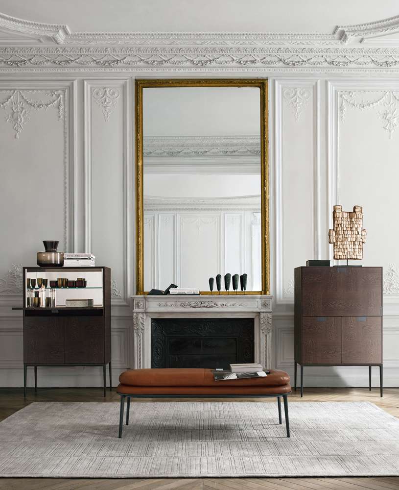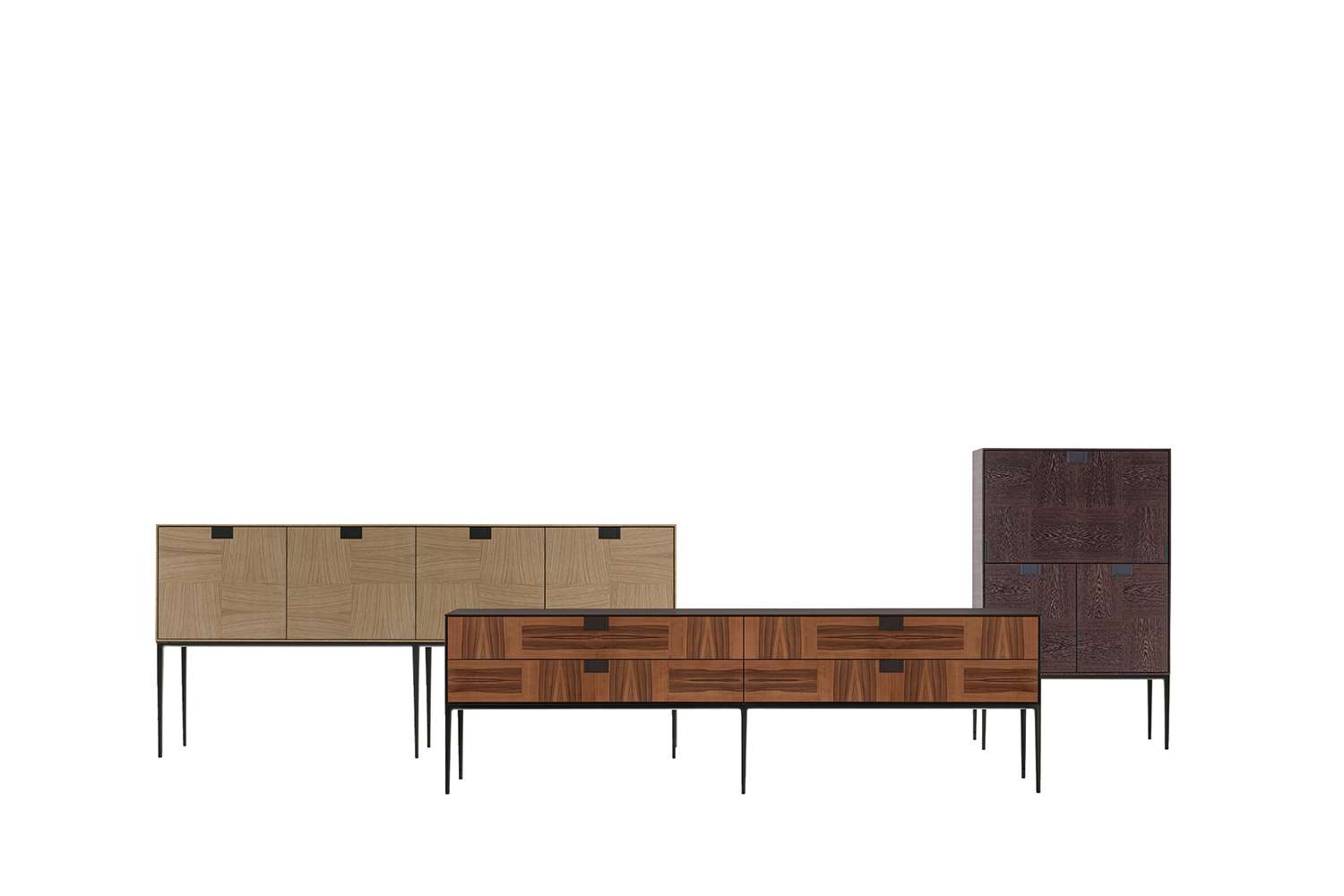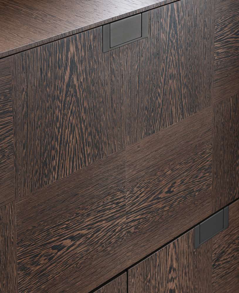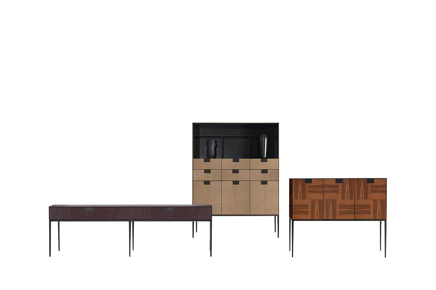 Alcor is a family of cabinets, sideboards and consolesmarked by rigorous aesthetic paired with precious wood surfaces, expression of the excellence of Maxalto’s artisan processes. Offered in different configurations, dimensions and heights, with hinged and flap doors, drawers and open compartments, these pieces have an inlaid damier checker board pattern in variouswoods to choose from: tineo, natural wenge and oak in the various finishes included in the collection (light brushed, black brushed, grey and smoked oak). The collection also includes three dining tables that are decorated with the checker board motif on the top and come in two rectangular sizes (cm.230x100 and cm.290x100) and one square version (cm.145x145). The entire series has a visually light structure with aluminiumsupports painted in graphite and amber finishes.