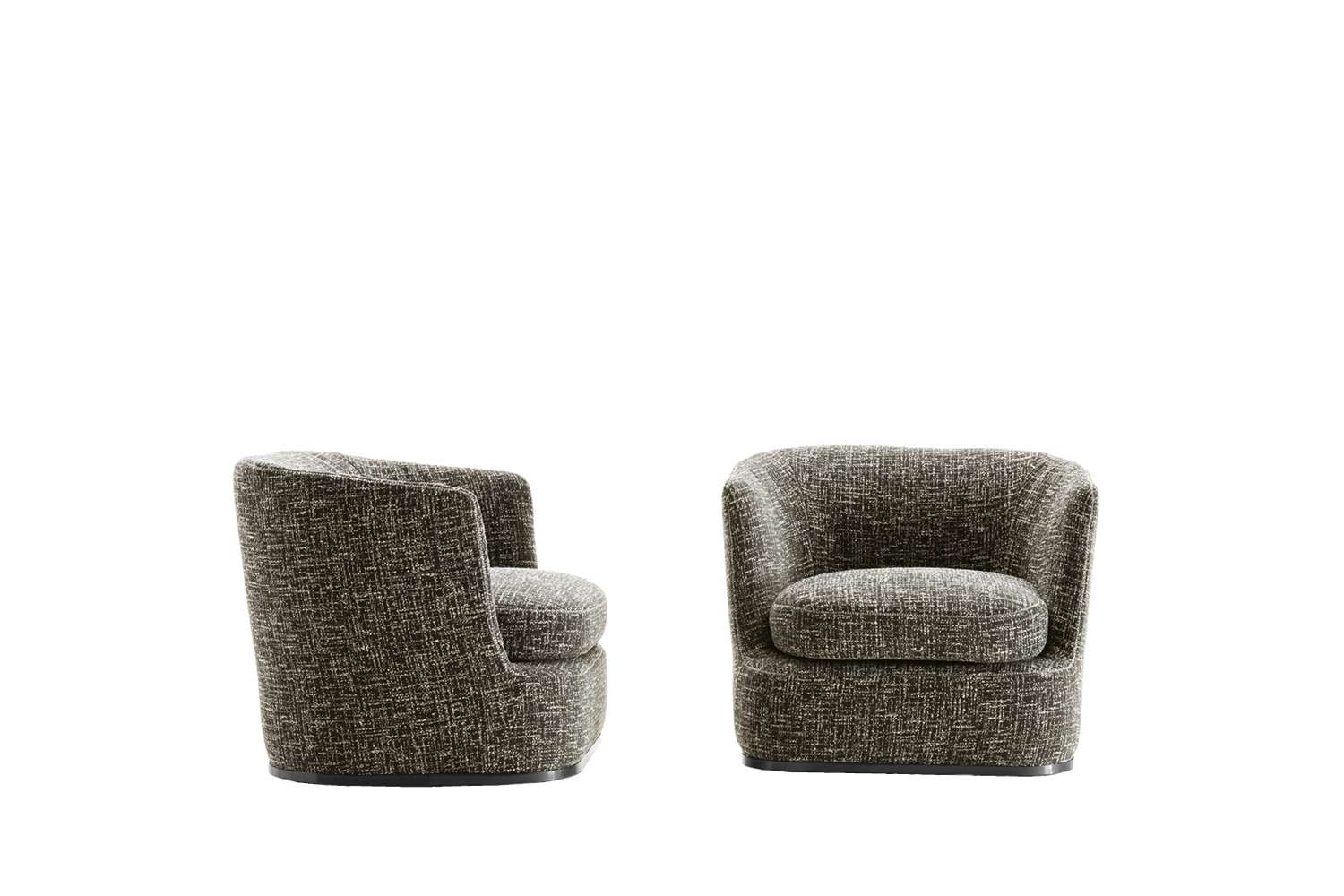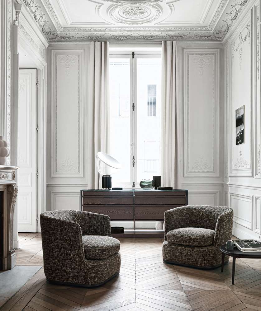 Linear sofa in two sizes, curved sofa, sofa with chaise longue, dormeuse and swivel armchair: these are the different elements that make up this seating collection with its distinct personality. They all have pleasantly curved but rigorous form, creating a very harmonious balanced aesthetic. The backrest design, seat depth, contoured shapes and generous padding are all elements that make Apollo extremely welcoming and comfortable. A rich selection of upholstery includes a wide range of fine fabrics and leathers. The fabric covers are further embellished with relief stitching, while the leather covers feature elegant “envelope” stitching. The structure is defined by a painted aluminiumborder in a range of sophisticated colours: bronzed nickel, black chrome, graphite and amber.
