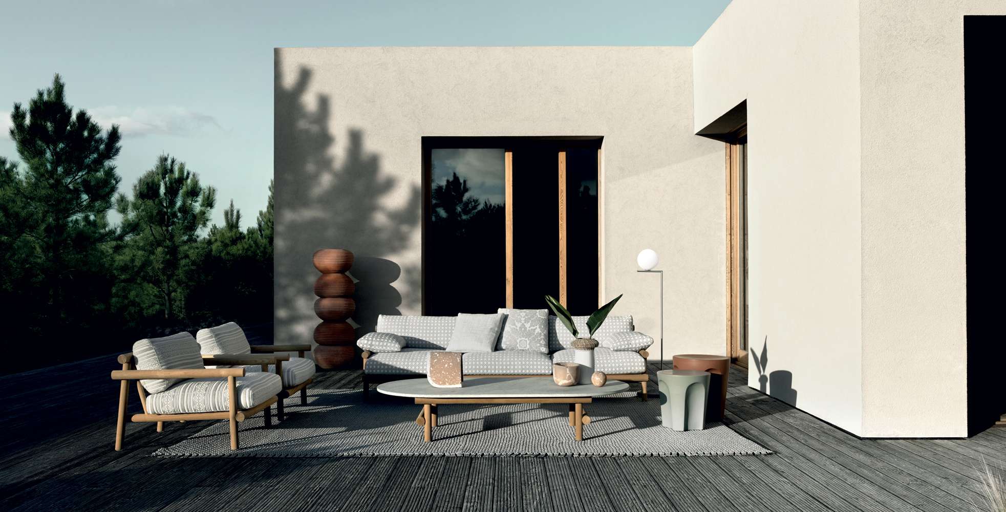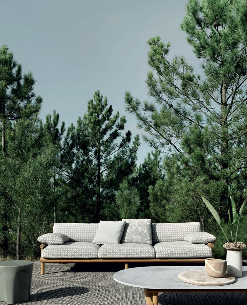 Minimalist and innovative, the Ayana collection becomes a new chapter in the story that connects B&B Italia to Naoto Fukasawa. It sees wood as the protagonist, interpreted in an unusual way, witha pleasant oriental touch. If the depths and heights are a clear reference to the south-east Asian tradition, the backrest recalls a Swedish wall bar, an exercise equipment turned into a load-bearing element. Thanks to this solution, the elements of the Ayana collection can be enjoyed and appreciated at 360 degrees, discovering on each side a new elegant interplay of intersections and proportions. Two and three seat sofas and the armchair have armrests at different heights. The armchair armrest is higher to guarantee a more ergonomic seat. The sofa armrest, which is lower, can be combined with a cushion that is easy to be fastened and removed, and helps to lie down more comfortably if necessary. The upholstery of this collection stands out for the individual cushions, all covered with waterproof fabrics.