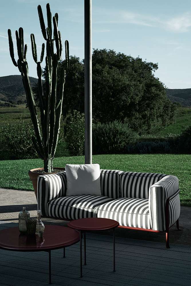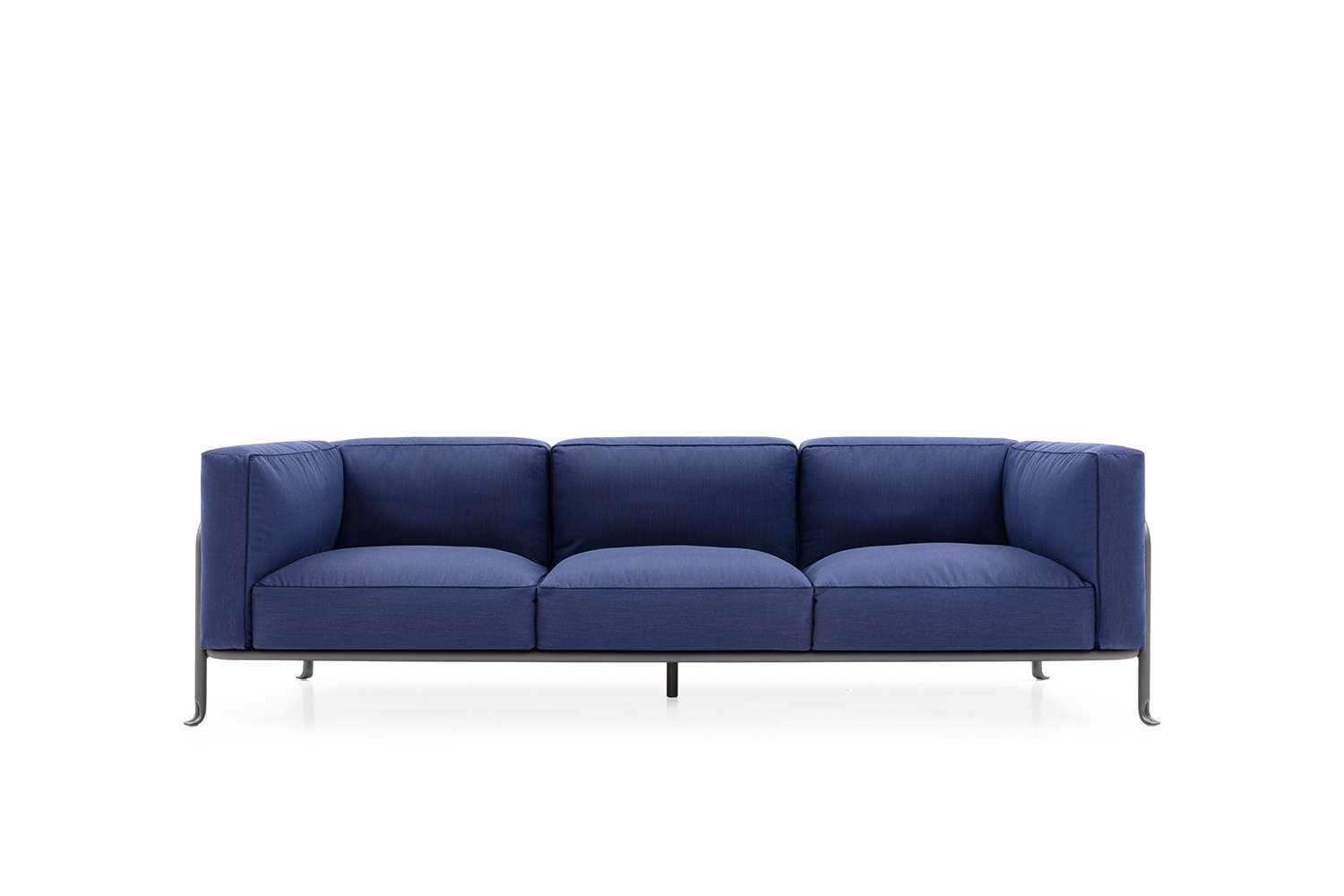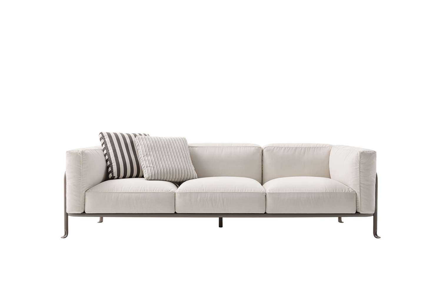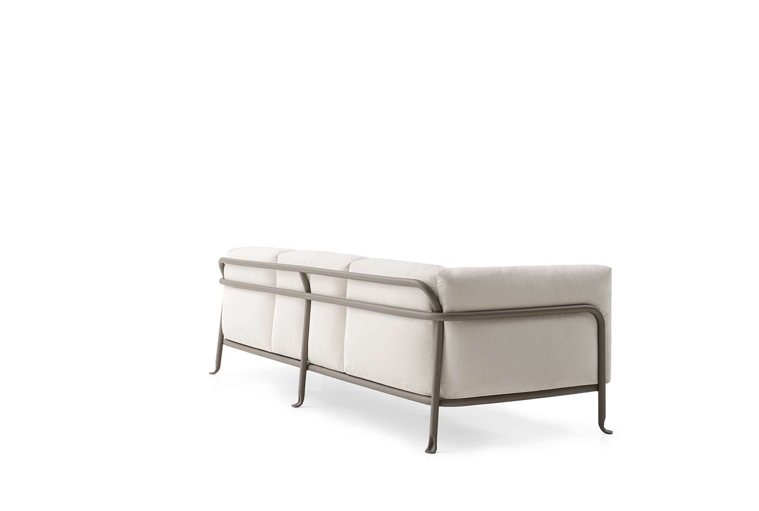 Borea is a complete and eclectic collection of outdoor seats and tables designed by Piero Lissoni. The numerous pieces in the collection have in common tubular metal structures with a fluid and seamless design, without joints and interruptions, captivating and even emerging in the detail that extends to the base. The metal bending processes take advantage of techniques typically used in the aeronautical sector and transport them into the world of outdoor furniture bringing life to a collection with an unmistakable style. The collection includes two- and three-seater sofas, an oversized armchair, a low small armchair and a dining chair, all with stackable aluminum structures painted. Comfort is ensured by generous cushions, which are not only soft and relaxing but were also developed to be sustainable. Paddings are in fact made with polyester fiber filling coming from recycled PET plastic bottles enveloping a different densities polyurethane core. 510 1500 ml bottles are needed to create the padding for a Borea three-seater sofa, 390 bottles for the twoseater sofa, 280 for the armchair.