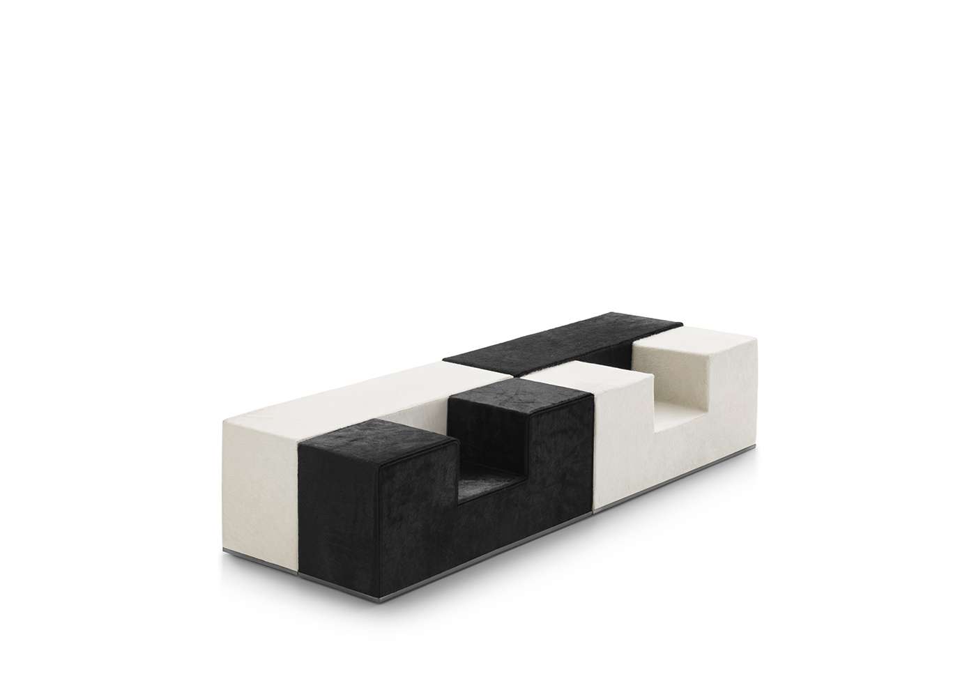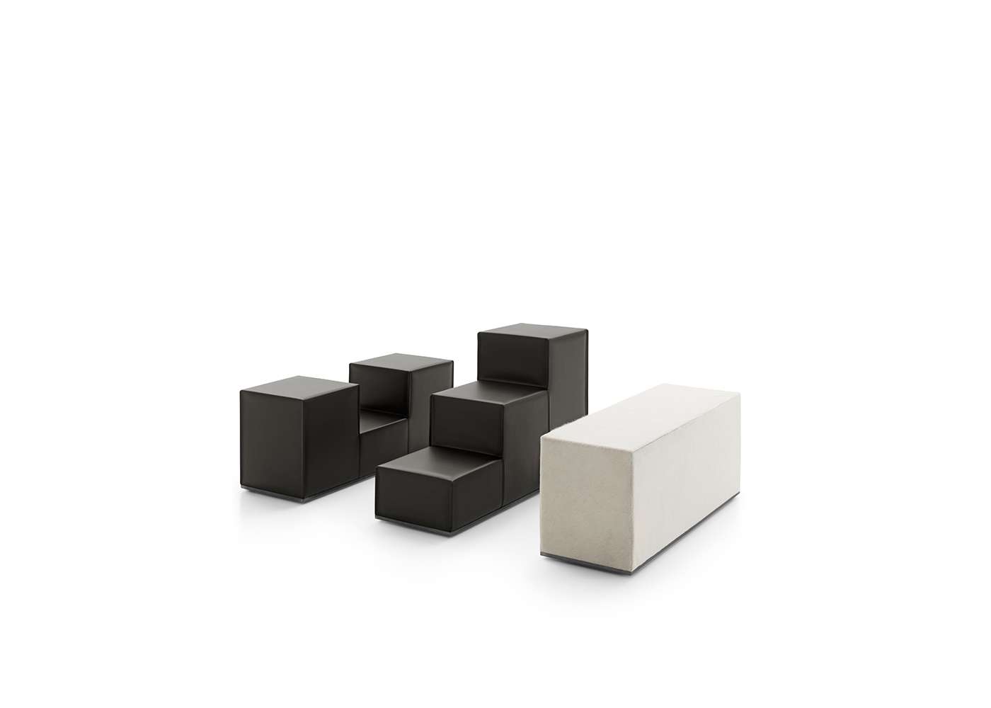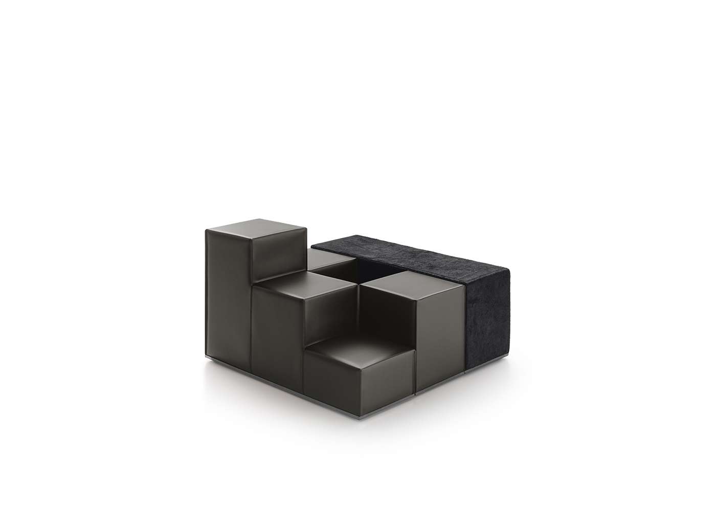 The flexible nature of Camaleonda continues and is completed by Gli Scacchi, the chess pieces, a series of accessories designed by Mario Bellini to become additional tables or seats. The three pieces that make up the series are inspired by the game of chess, in particular the queen, the knight and the rook (hence the Italian names Regina, Cavallo, Torre), light and easy to move like on a chessboard. “They are among the most playful pieces of furniture I have ever designed”, Bellini states, underlining the free and amusing spirit they bring to interiors. In the 1971’s original version, Gli Scacchi represented a remarkable technical innovation as they were produced in self skinning polyurethane foam, a solution which was initially used only by the automotive industry and introduced for the first time in furniture. The 2020 reissue offers soft covers made of thick leather or Kanu leather with visible stitching. The shape of the three elements elaborates on and develops the parallelepiped, through structures made of soft polyurethane that perfectly synchronize with the dimensions of the Camaleonda. At the base there is an elegant metallic profile, an element that defines the geometry of the shape in contrast, with the softness of the object.