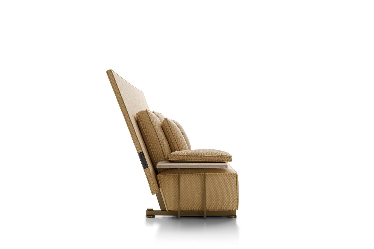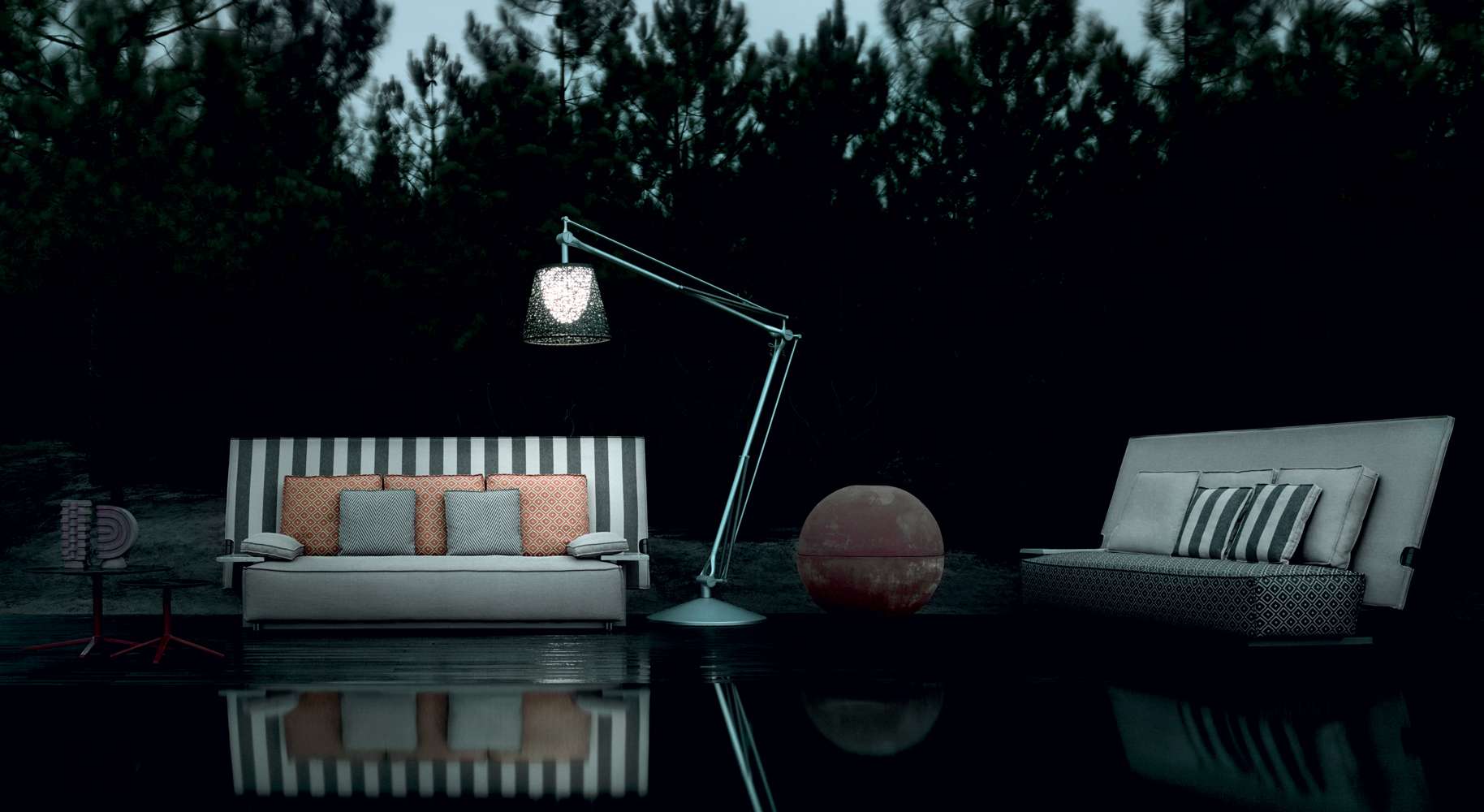 The very first collaboration between B&B Italia and Philippe Starck leads to the birth of a sofa and an armchair, both with impressive dimensions and a highly scenographic presence, that surprisingly combine an unusual shape and an unexpected function, with a name that really attracts attention. Oh, it rains! is a piece of considerable impact, destined to last over time and to be talked about, but also to be used in the most unexpected ways and contexts. Philippe Starck started his research for this project by going back to the origins of outdoor furniture, that of nomads and soldiers: desert tents and field equipment, colonial colors and very light materials, essential shapes with functions connected with rapid action. We notice Oh, it rains! right away for its large backrest. It isn’t a simple decorative element, though. It acts like a wall or a partition to create an intimate and private setting, and, when necessary, it folds down on top of the seat and - voilà - the seat and cushions are covered and protected. Colours and materials go hand in hand with the initial concept and the collection introduces colonial shades and raffia-effect waterproof fabrics.