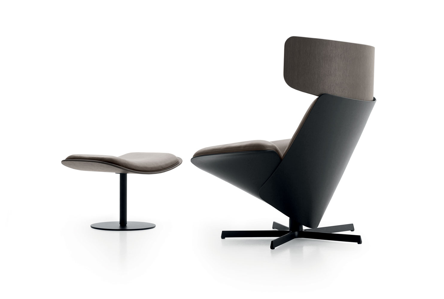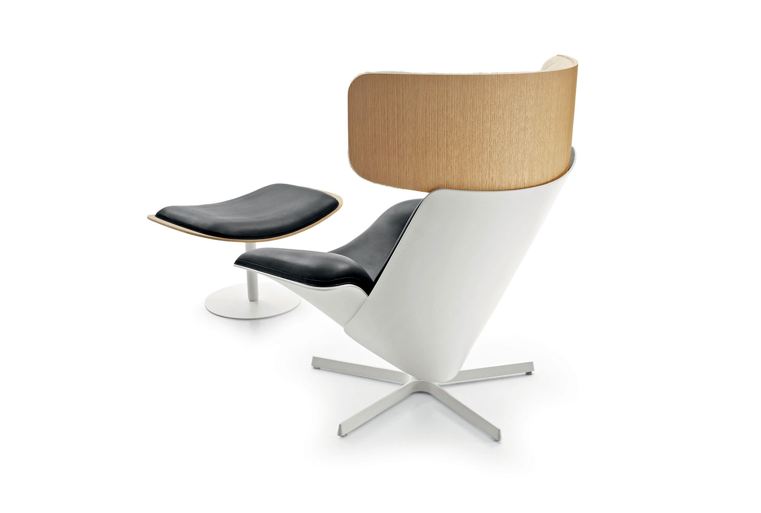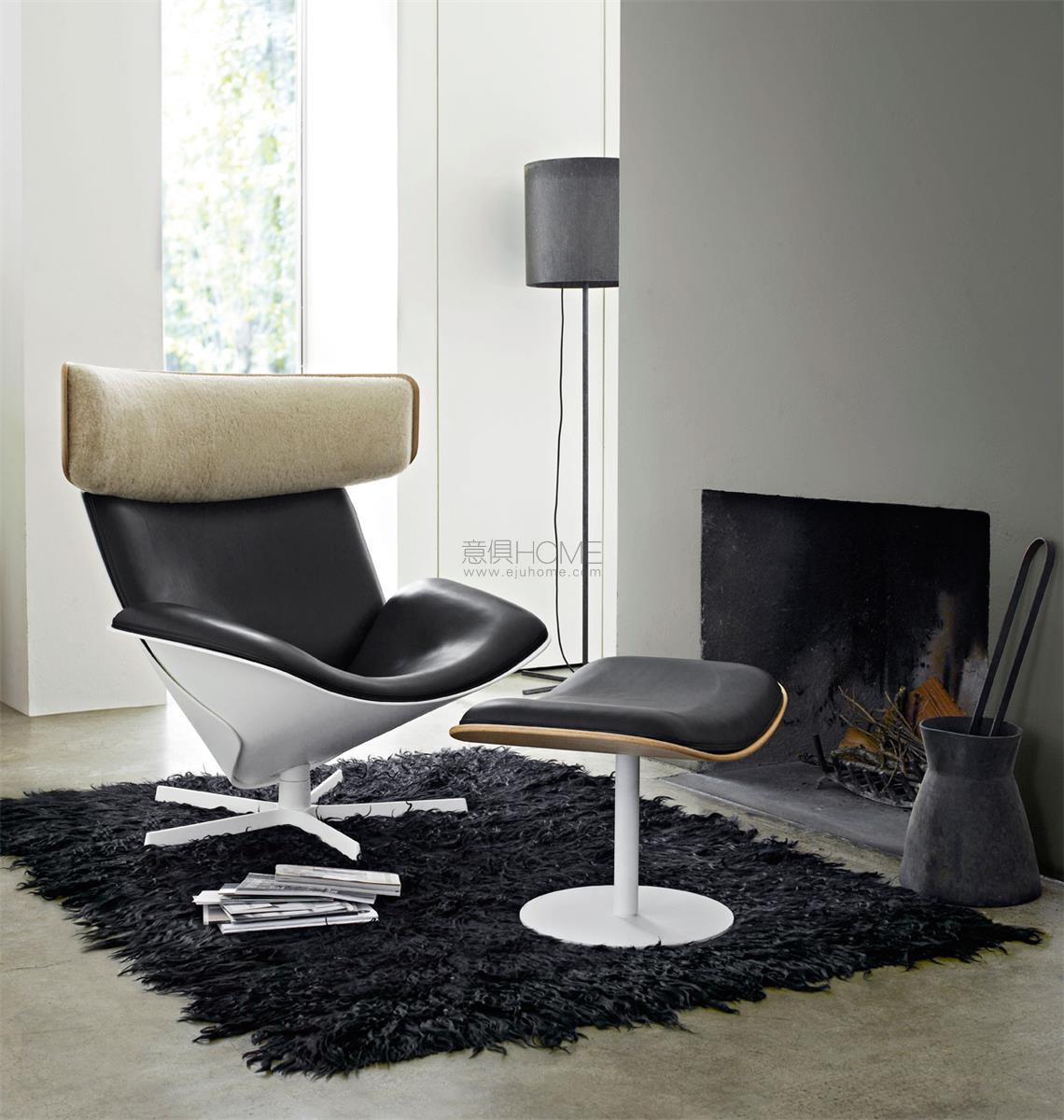 這款轉(zhuǎn)椅專注于放松休閑,它包含兩個(gè)圓錐形玻璃纖維外殼:一個(gè)將底座和靠背連接在一起的座椅。頭枕是一塊帶有弧度的橡木,內(nèi)部有填充物,并從靠背上向外伸出。這款椅子的突出之處是它在眾多不同元素、材料和皮革飾面之間找到了平衡——還可以選擇用美利奴羊毛作為頭枕的材料。
