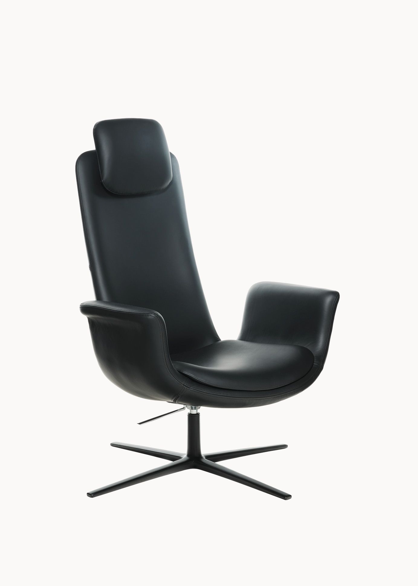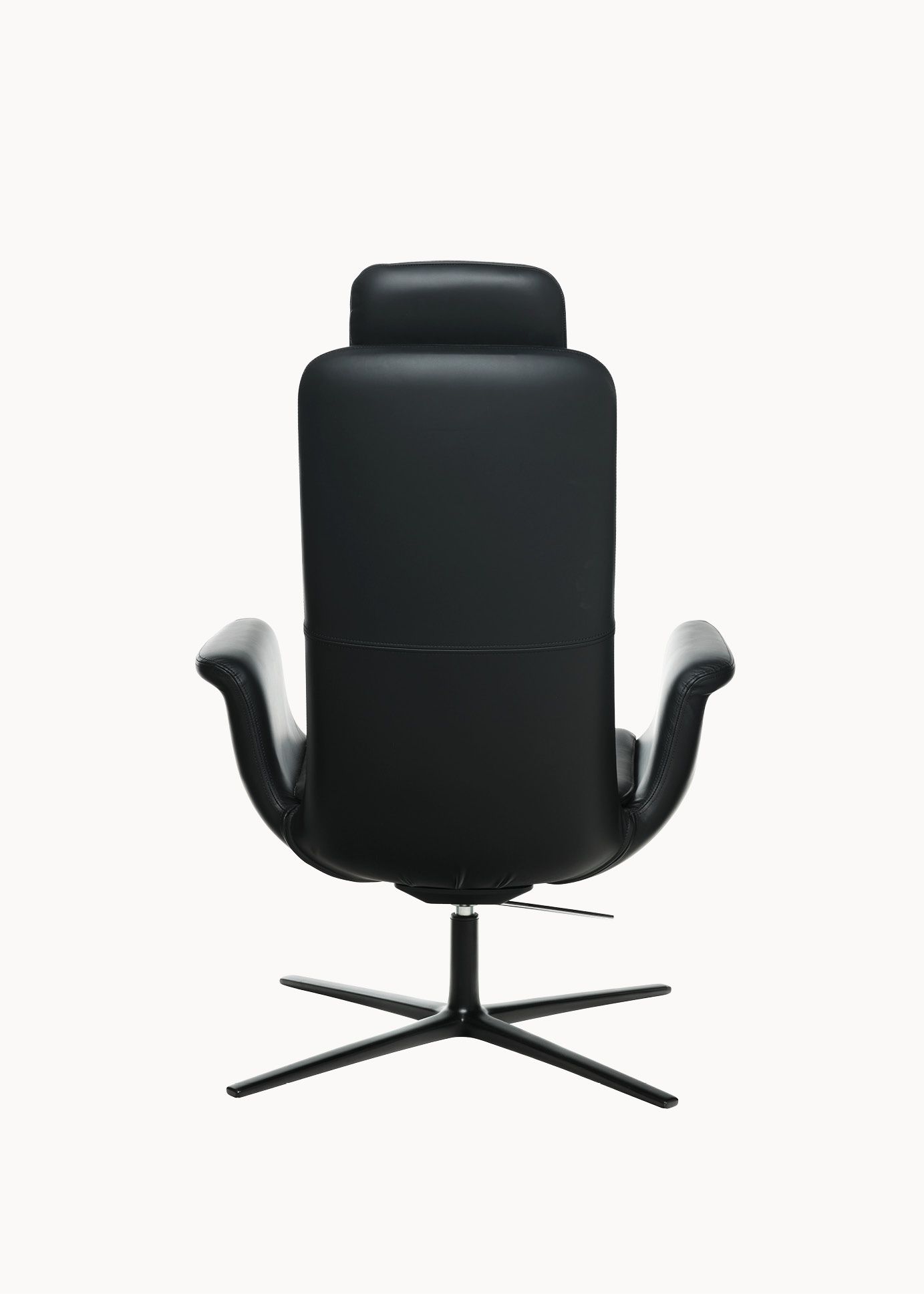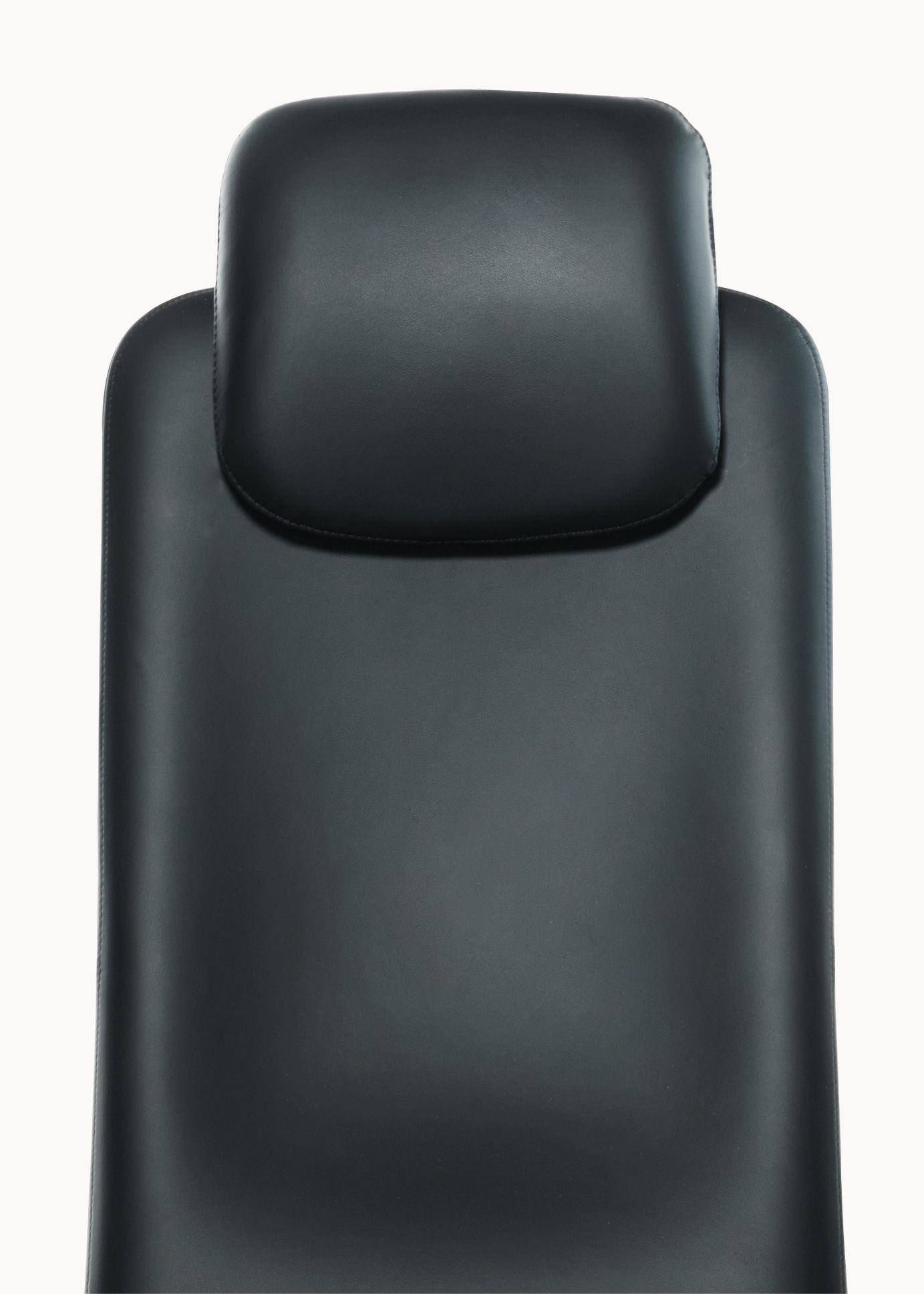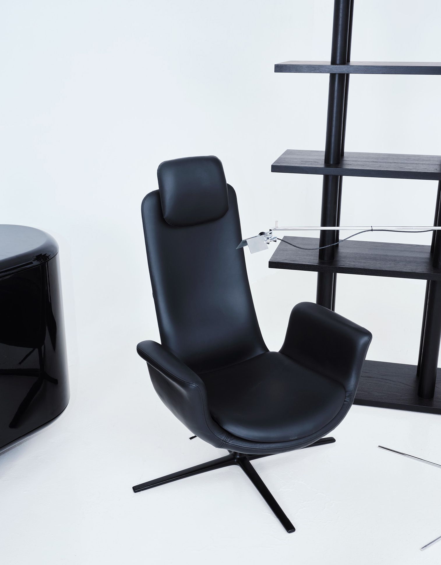 Odyssey could be described as autobiographical. Reflecting the journey from the designer’s native Ibiza to explore the nature of Space through his eclectic oeuvre. An expression of gravity-defying seating that envelops the human body. Its kinetic and sculptural qualities come together in a fluid silhouette. The adjustable headrest and tilting mechanism together with the curved forms recall futuristic Science Fiction.