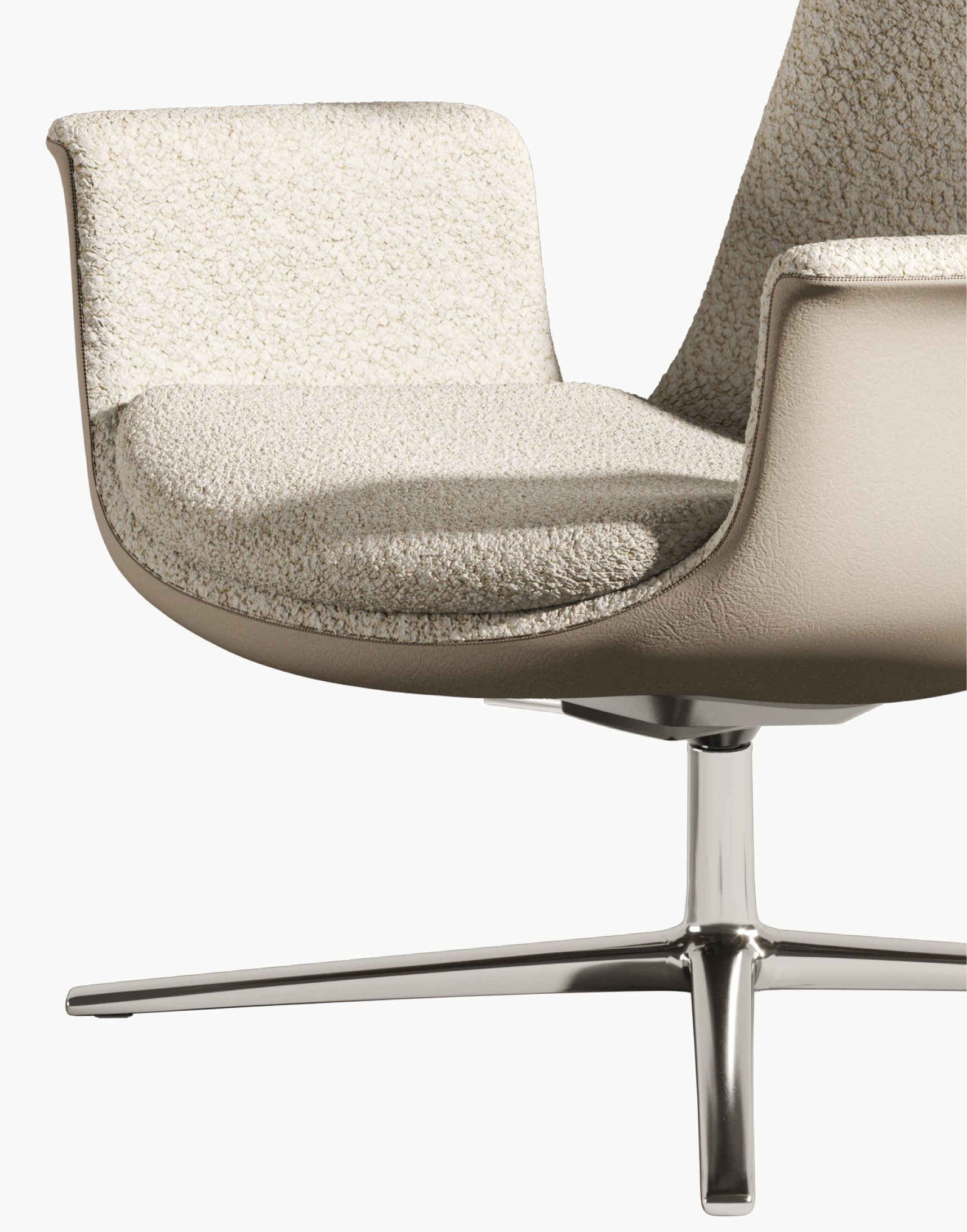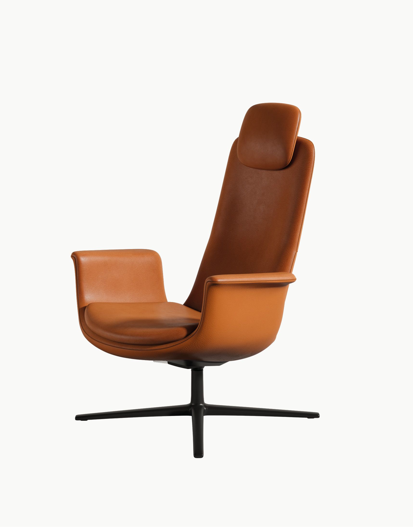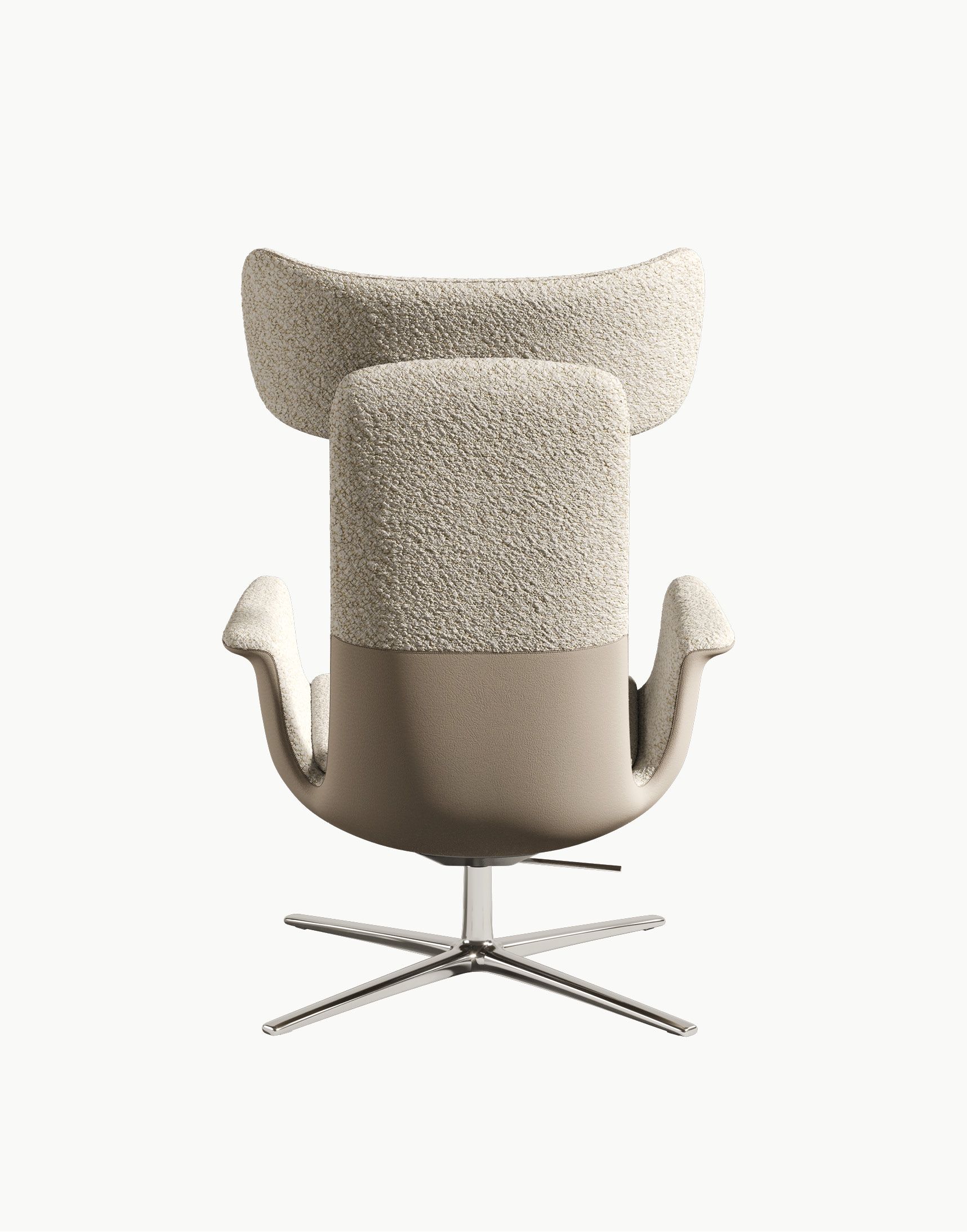 Odyssey could be described as autobiographical. Reflecting the journey from the designer’s native Ibiza to explore the nature of Space through his eclectic oeuvre. An expression of gravity-defying seating that envelops the human body. Its kinetic and sculptural qualities come together in a fluid silhouette. The adjustable headrest and tilting mechanism together with the curved forms recall futuristic Science Fiction.
