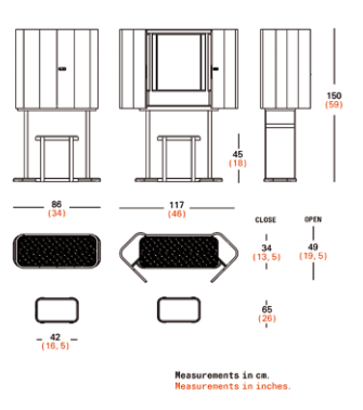 negro brillante. Partes interiores en roble macizo barnizado natural. Estructura exterior en hierro y