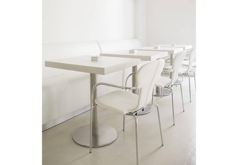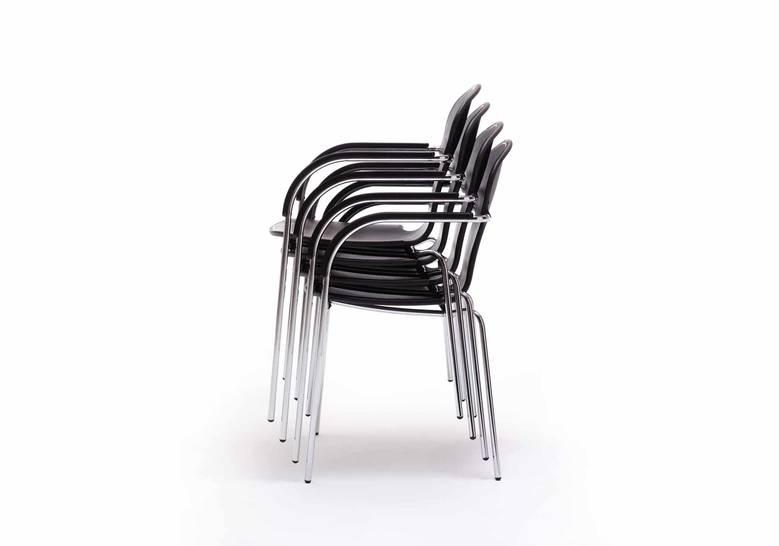 Estructura en tubo de acero cromado. Asiento monocarcasa, en Polipropileno inyectado con gas en blanco o negro, o tapizado.