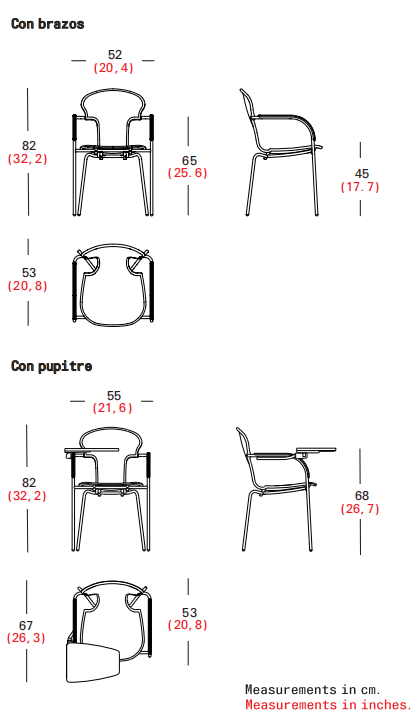 Pupitre de plástico abatible para silla en compacto negro. Apoyabrazos opcionales en integral de color negro o gris.