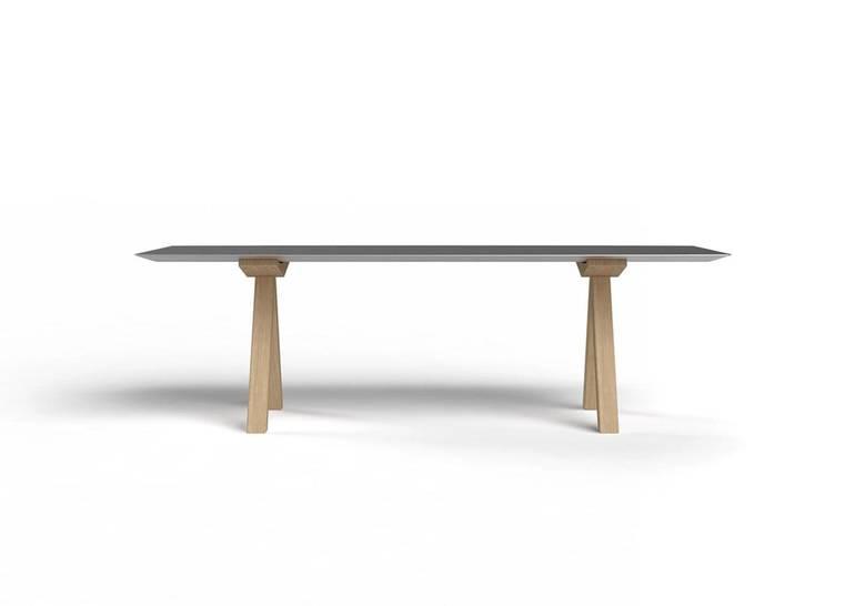 Sobre en extrusión de aluminio con bisel. La cara superior se puede aplacar con chapa de estratificado. Existen tres tipos de patas: en hormigón arquitectónico gris, varilla inoxidable y en roble natural con barniz al agua.