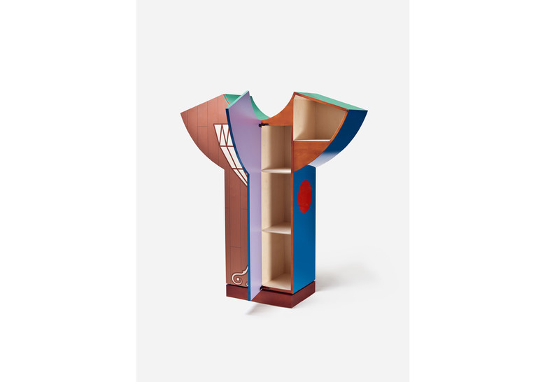Mueble formado por tableros de MDF lacados en diferentes colores. El interior está chapado en madera de