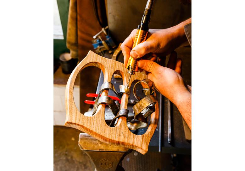 se une por medio de dos cintas de acero patinado en latón a otros dos elementos, también de madera,