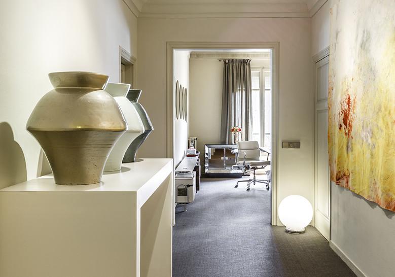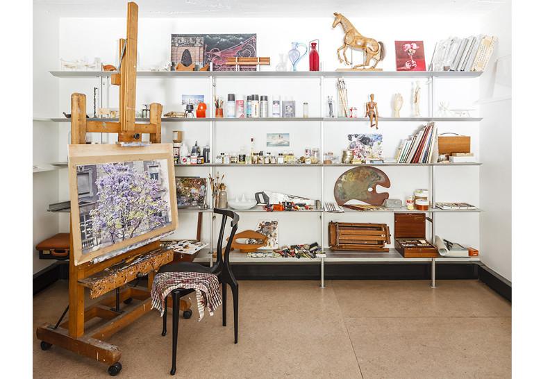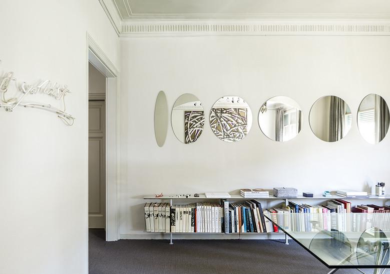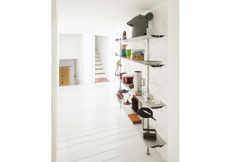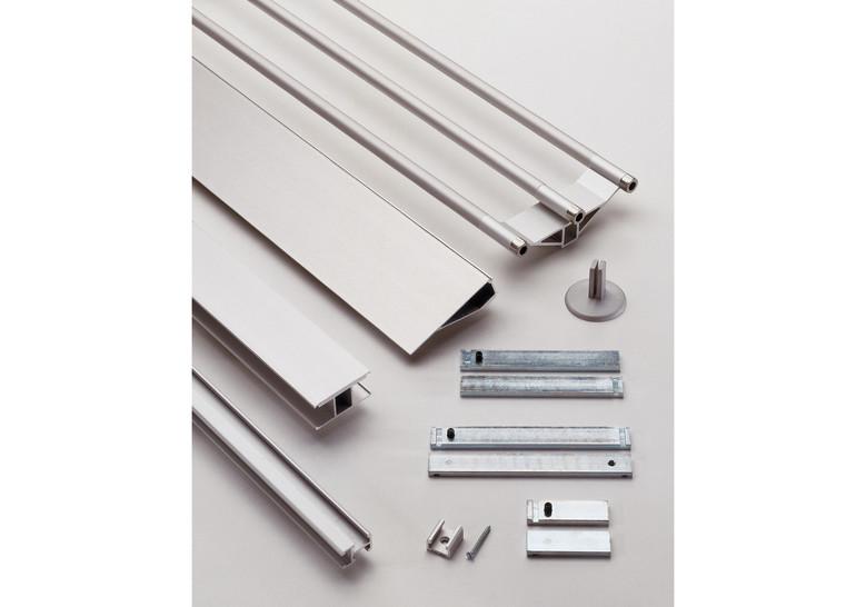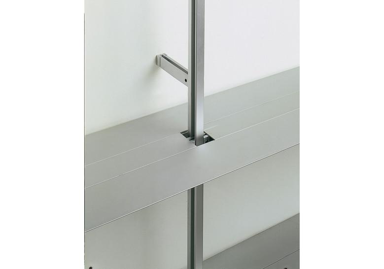 Estantes y soporte vertical en extrusión de aluminio, cepillado y anodizado plata. Herrajes de sujeción en