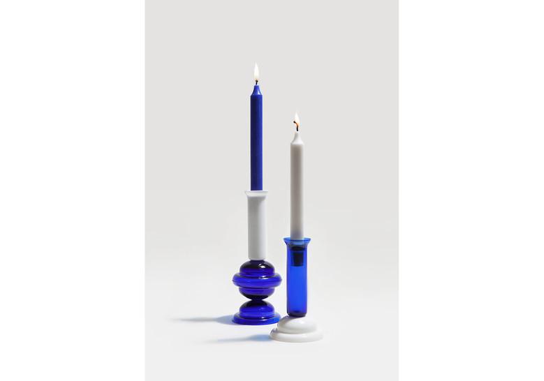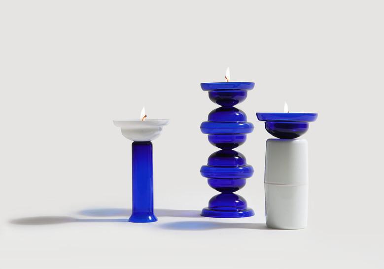 Piezas de vidrio pegadas entre sí mediante adhesivo. Porta velas en acero latonado.