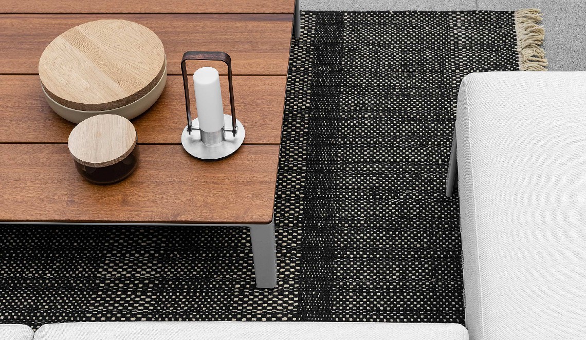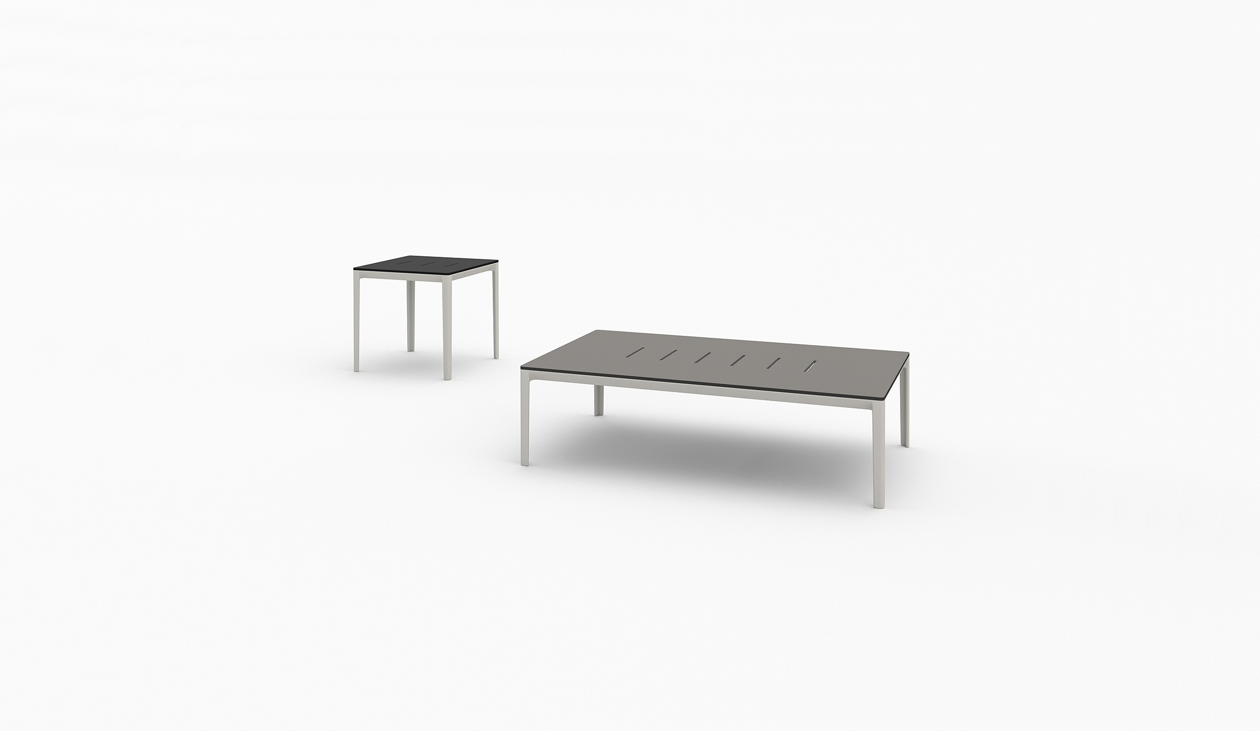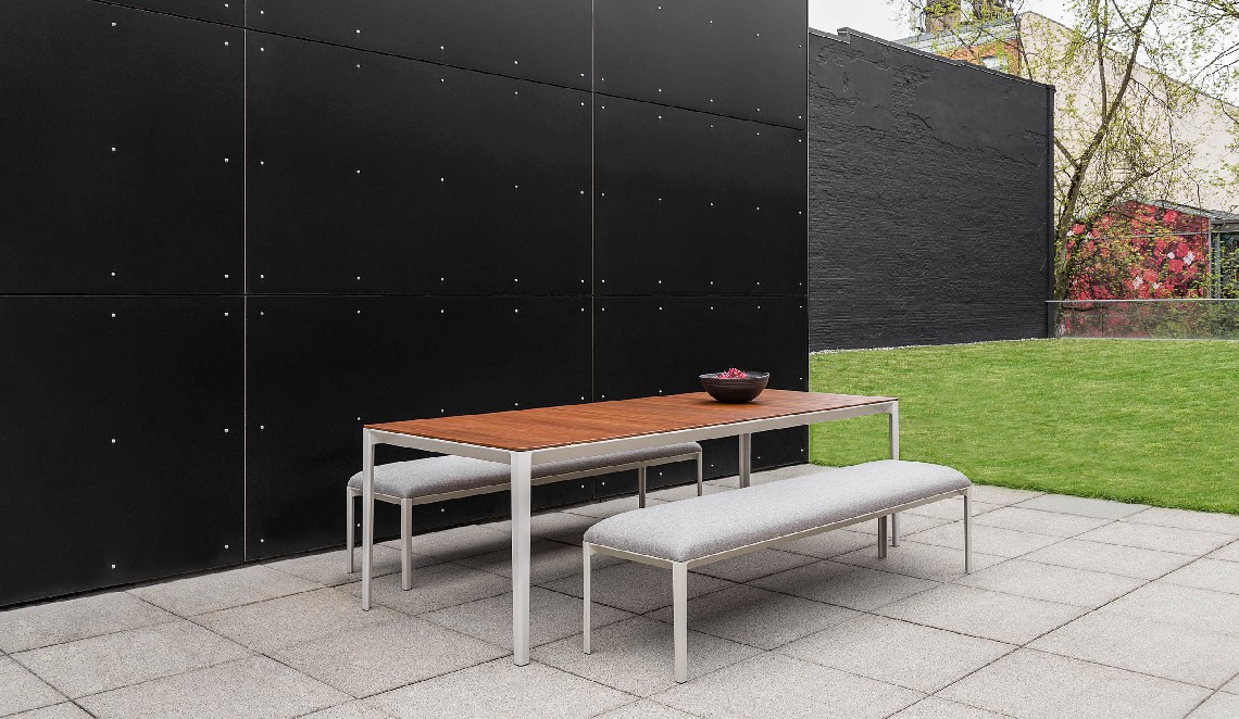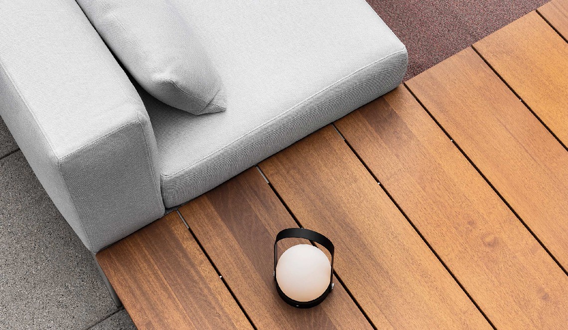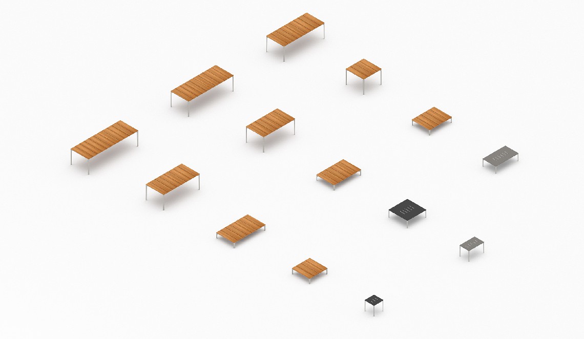 Following the table perimeter a thin beveled edge adds visual lightness, while the tapered cast aluminum legs denote strength and rigidity. Configured as a dining or coffee table the spacing of the wood slats create small gaps that allow for water drainage. A similar detail is repeated in the occasional and low tables whereas diminutive linear slits perforate the Polaris surface.