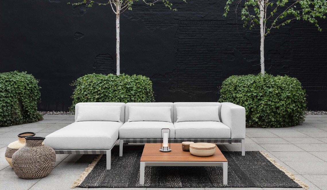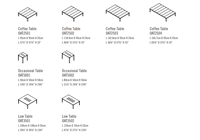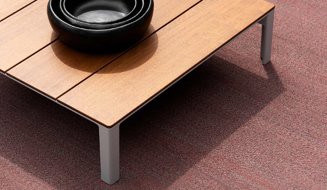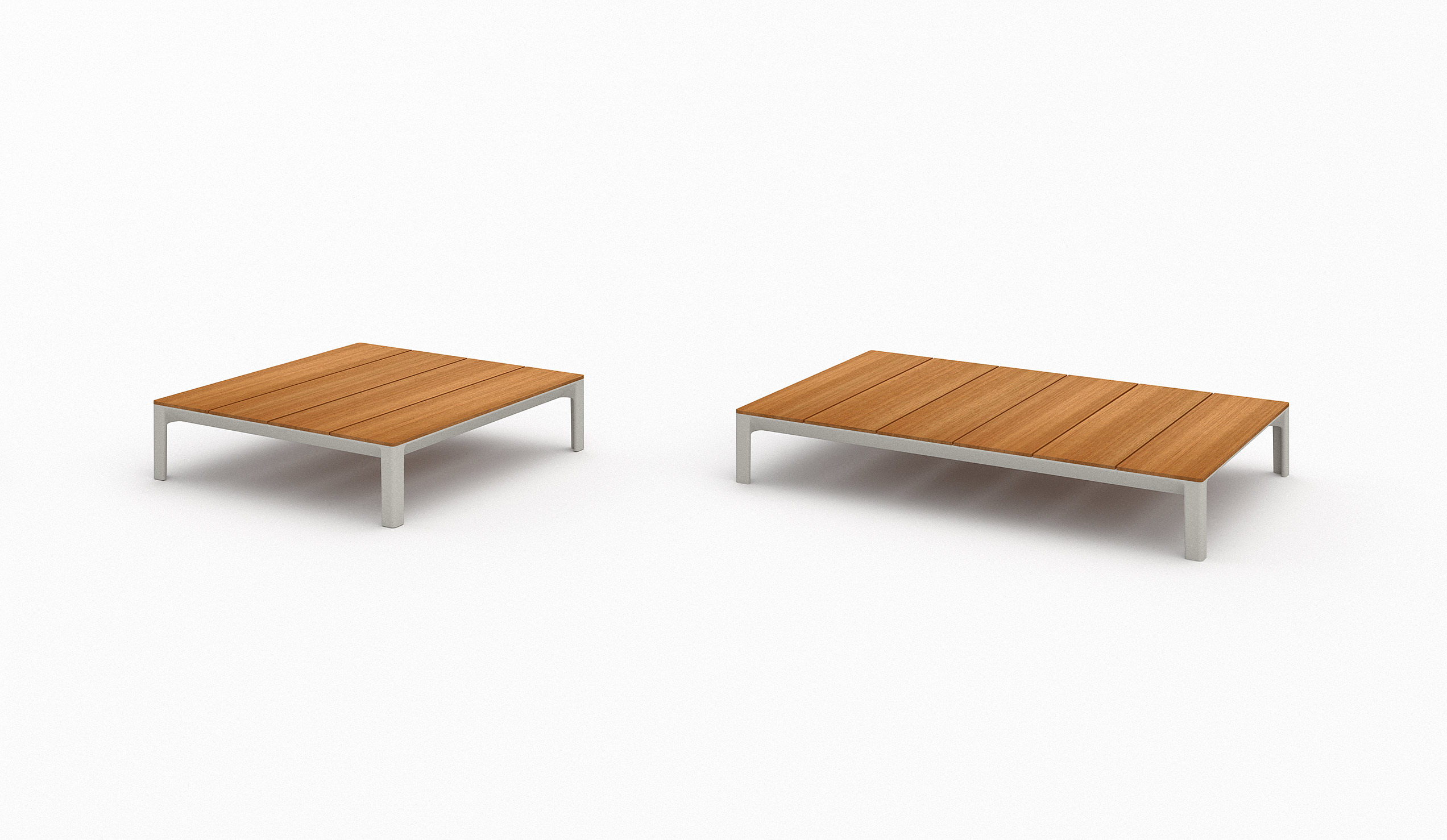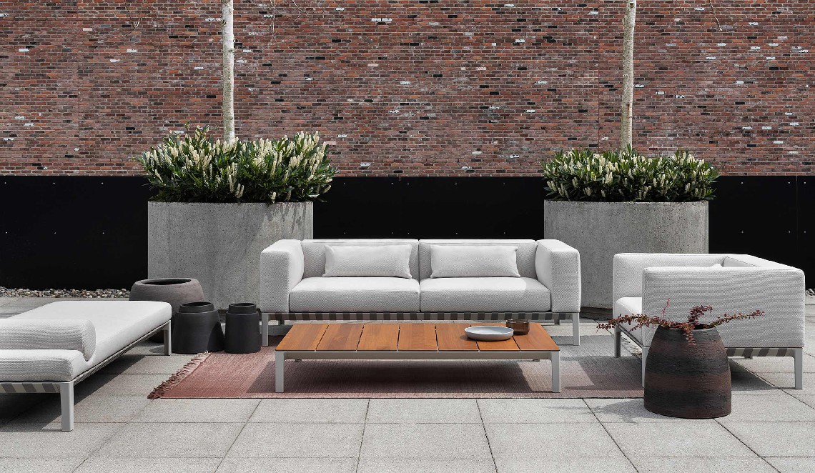 Following the table perimeter a thin beveled edge adds visual lightness, while the tapered cast aluminum legs denote strength and rigidity. Configured as a dining or coffee table the spacing of the wood slats create small gaps that allow for water drainage. A similar detail is repeated in the occasional and low tables whereas diminutive linear slits perforate the Polaris surface.