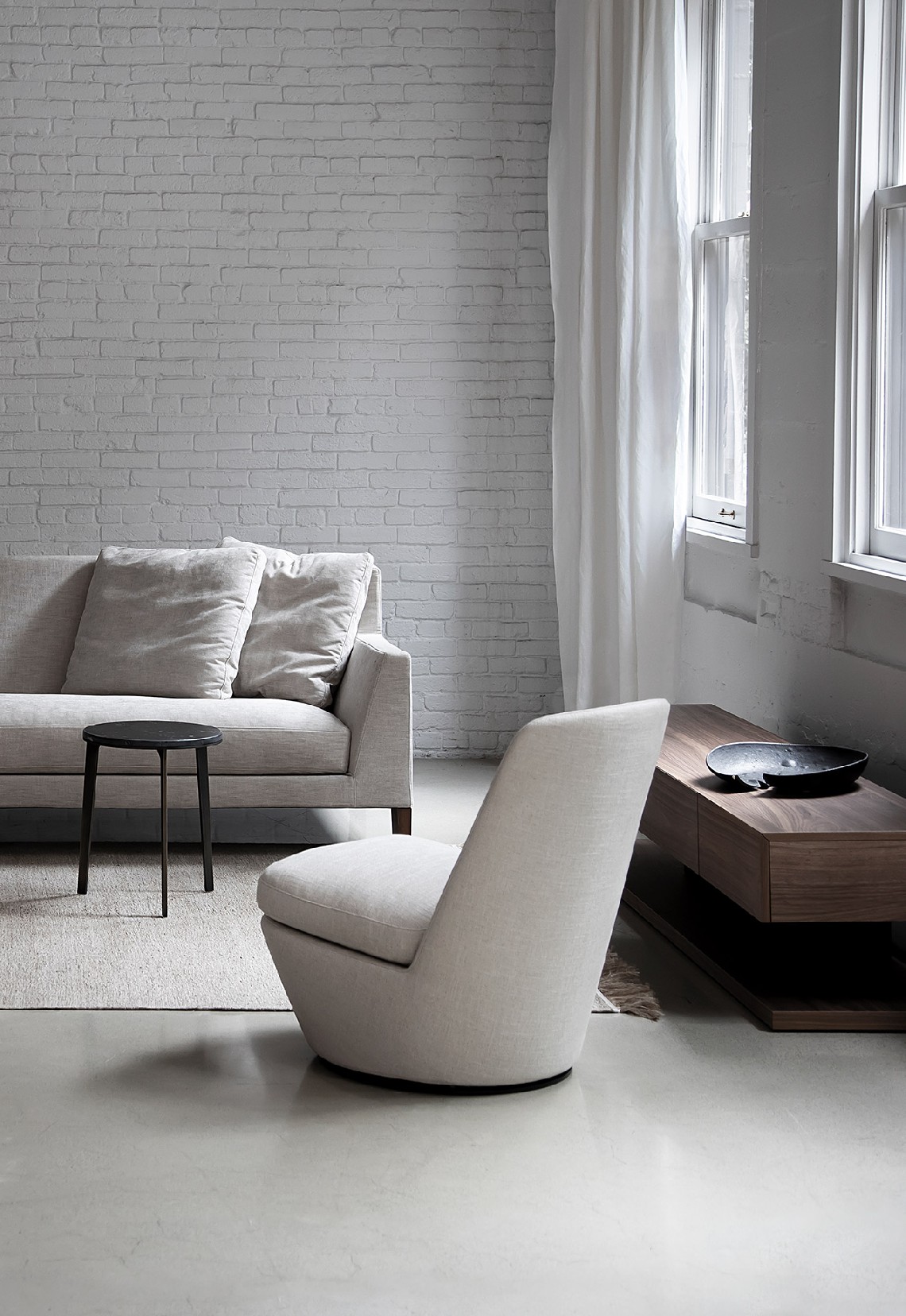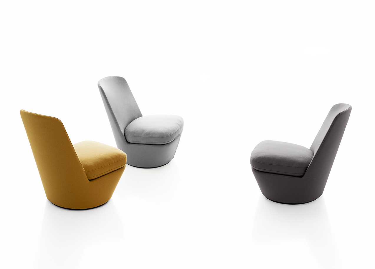 Pre is an armless swivel chair with a surprisingly small footprint. It combines downy comfort and clean lines in a trim little package.