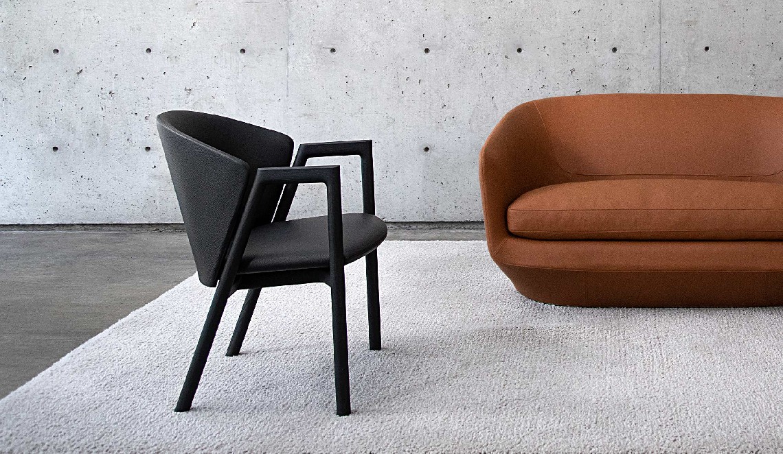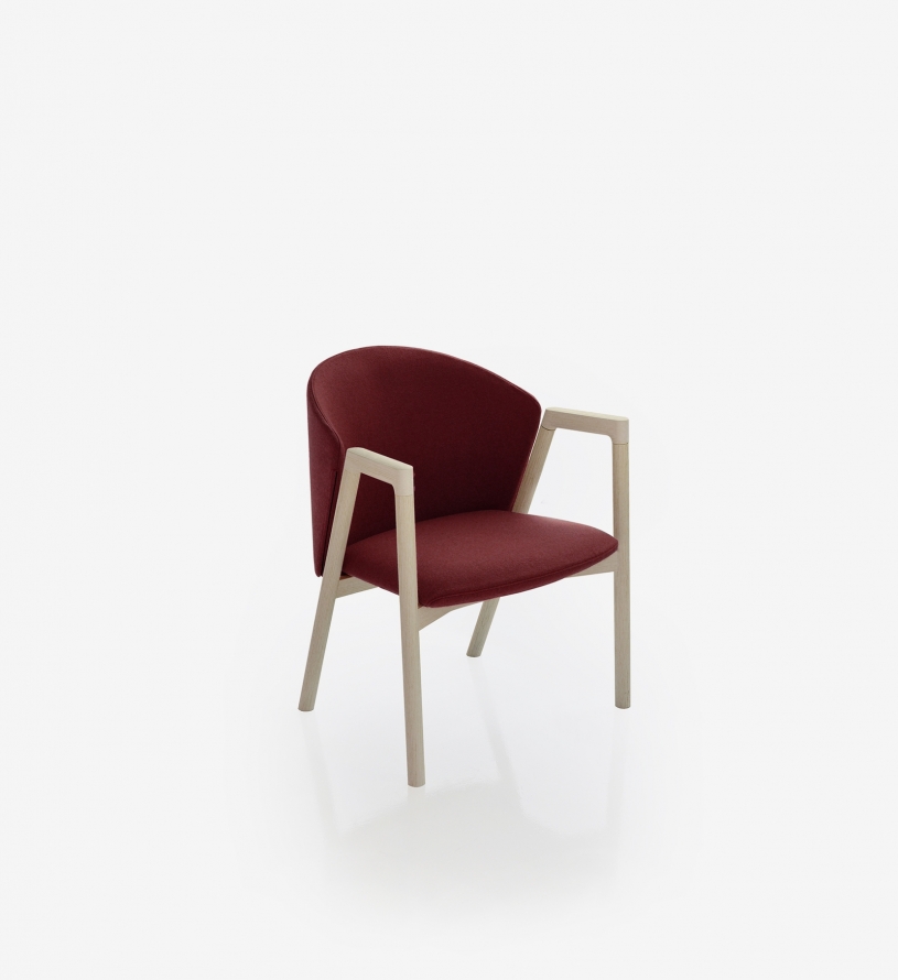 Its solid wood frame is complemented by a cold-foam seat and flexible cold-foamed backrest. The chair has removable covers and features self-cleaning upholstery thanks to the space between the seat and backrest which allows crumbs to escape freely.