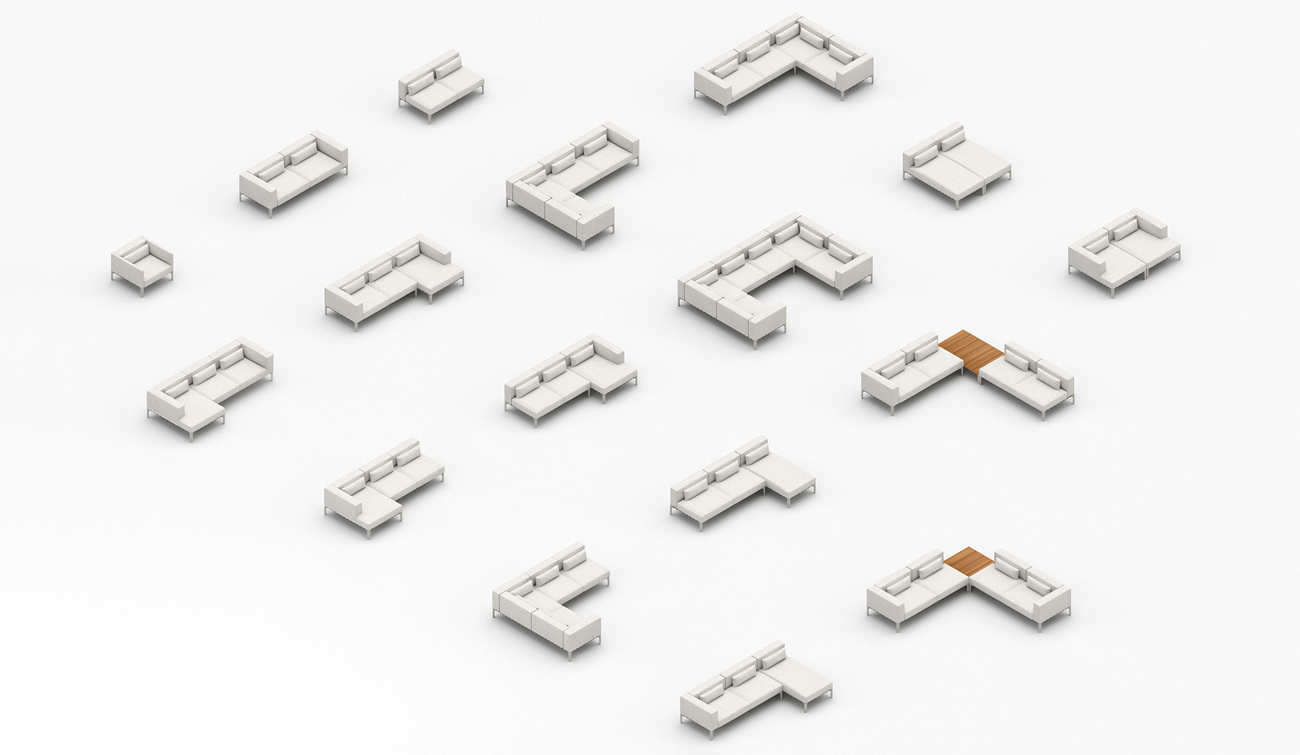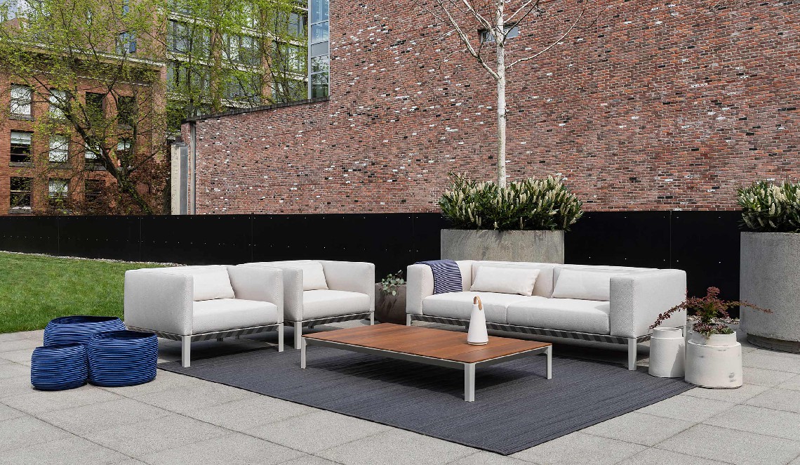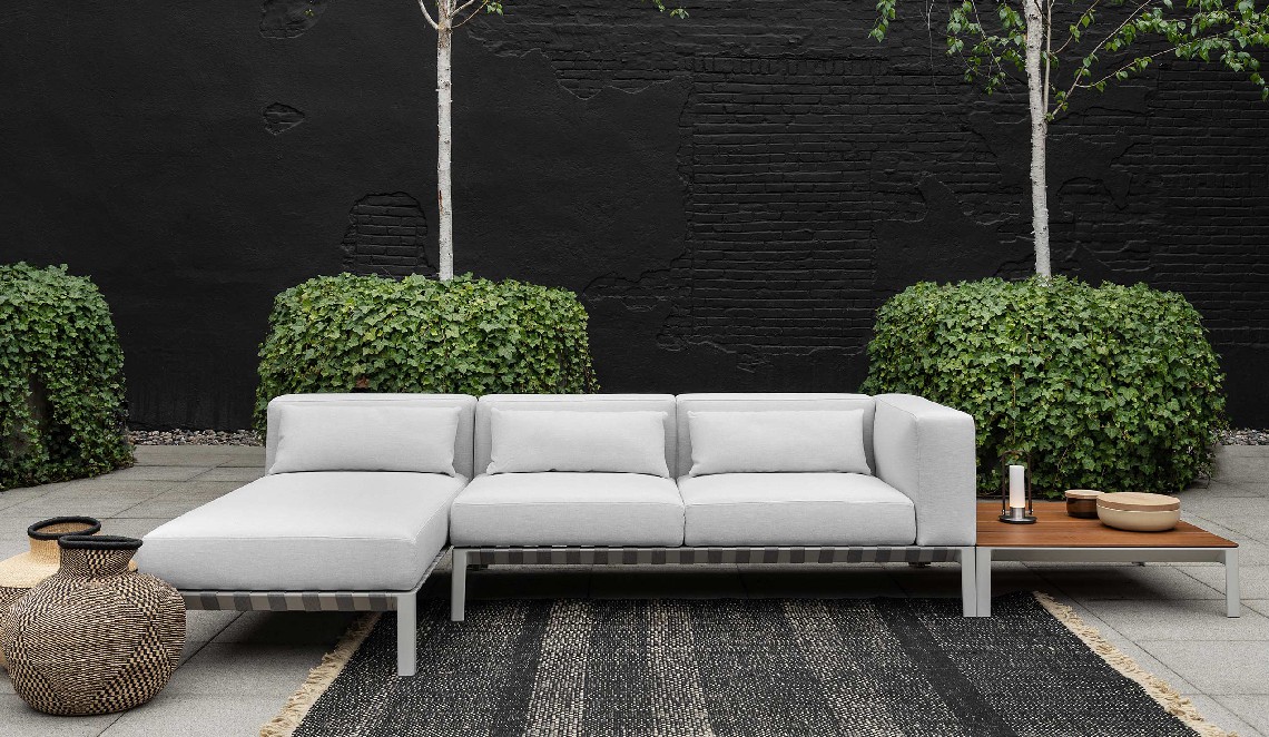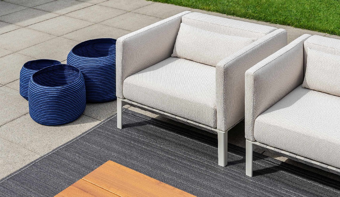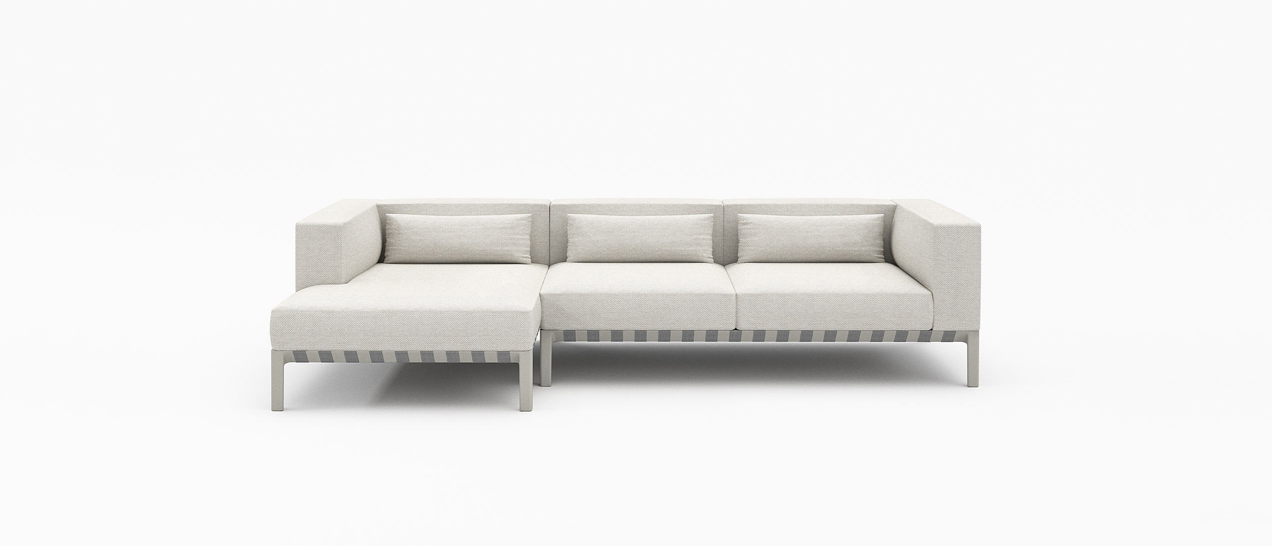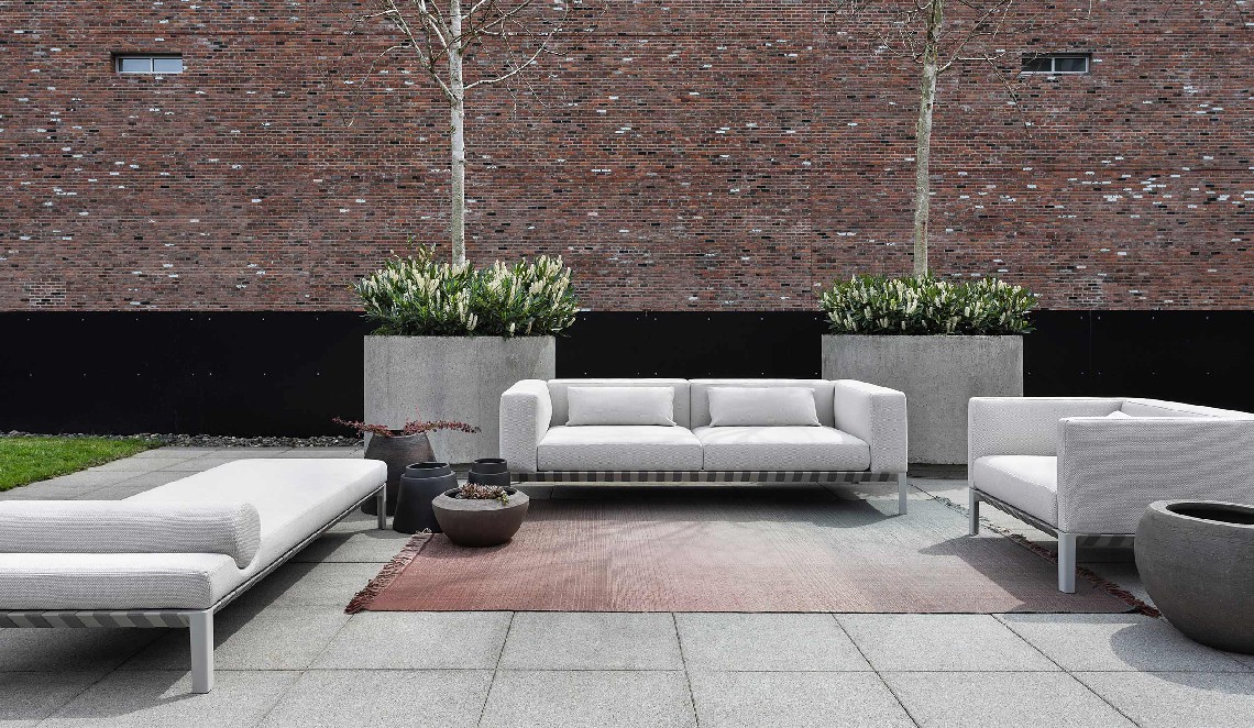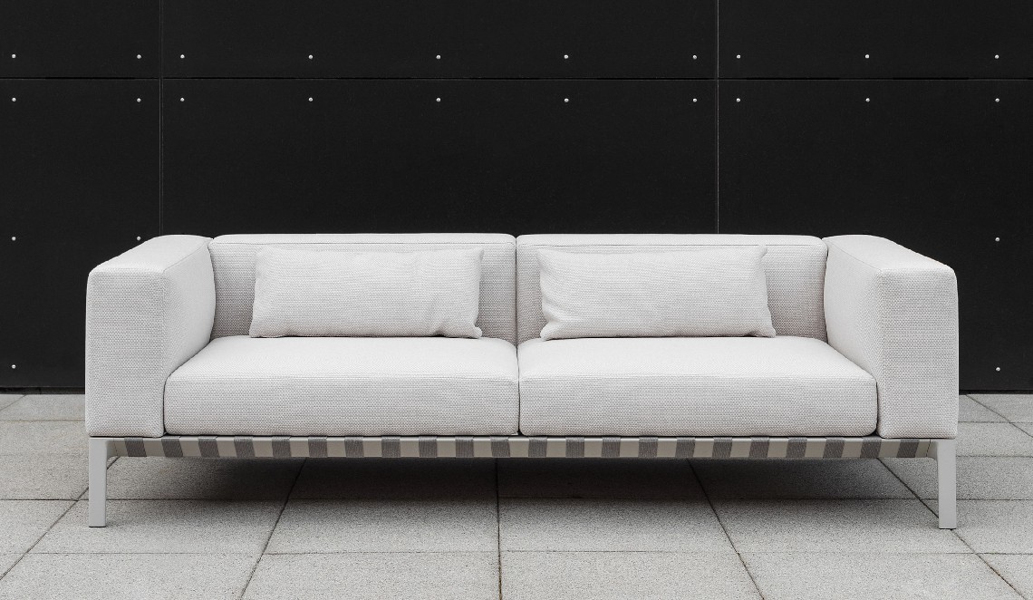 The generous shapely upholstery ensures comfort and achieves visual lightness supported by the woven bands that wrap the slender orthogonal frame.