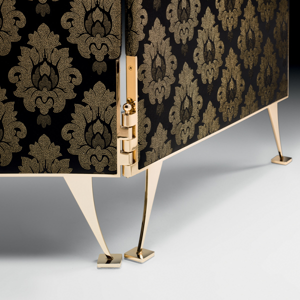 polyurethane, upholstered in fabric. Metal frame in polished gold finishing.