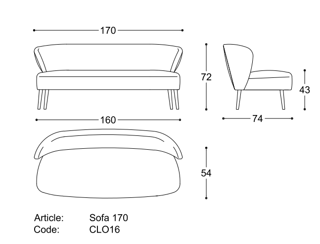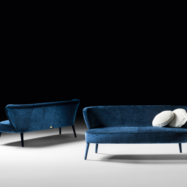 Sofa with structure in beech wood, seat and back in fire-resistant expanded polyurethane. Feet upholstered. Non-