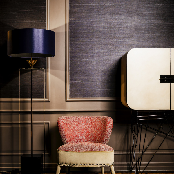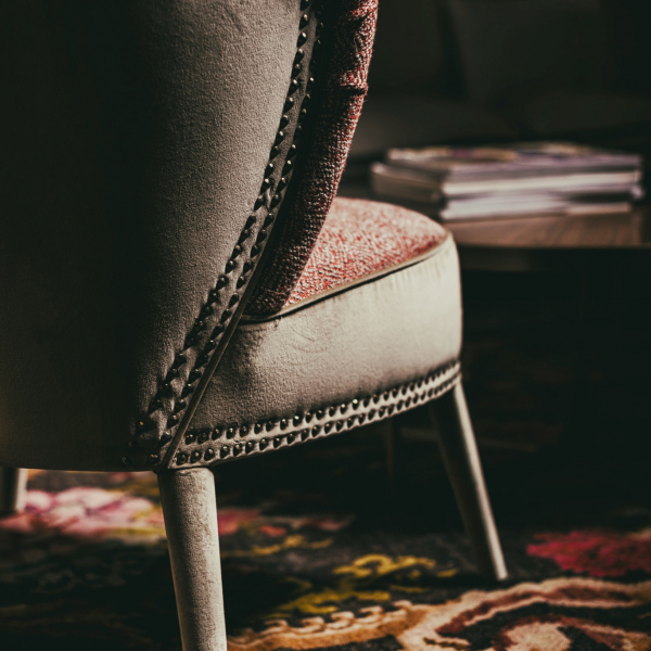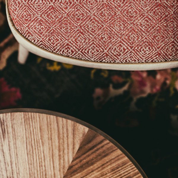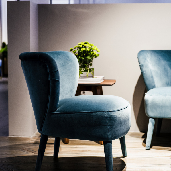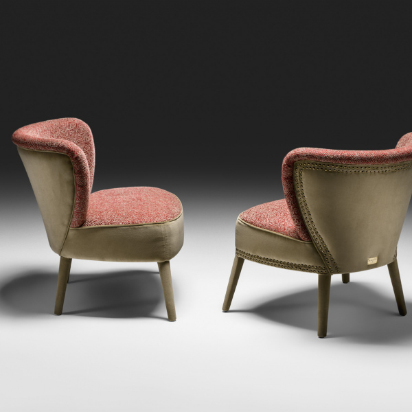Armchair with structure in beech wood, seat and back in fire-resistant expanded polyurethane. Feet upholstered.