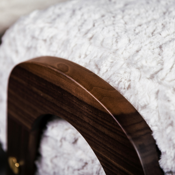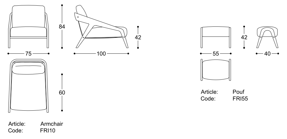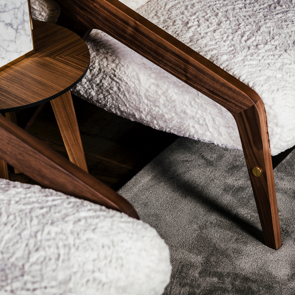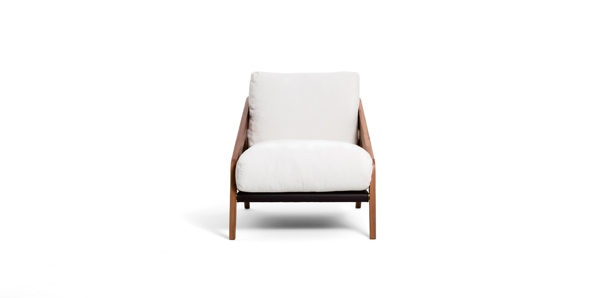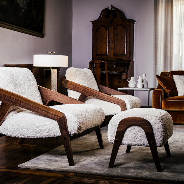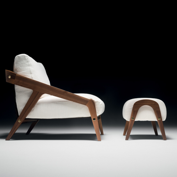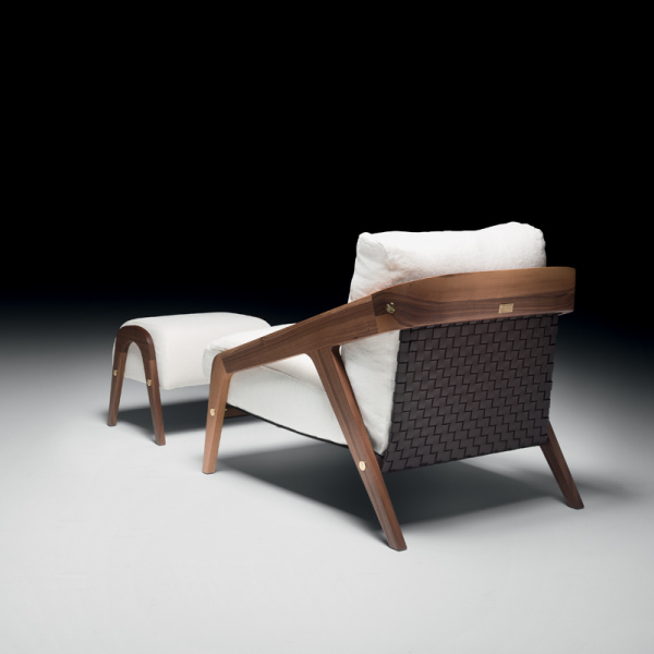Armchair and ottoman with structure in Canaletto walnut solid wood, water-based painted. Seat cushions in
