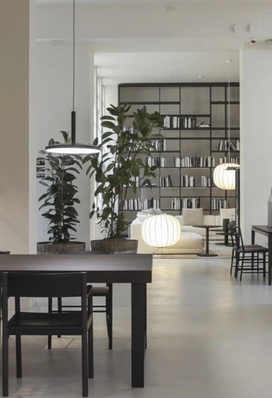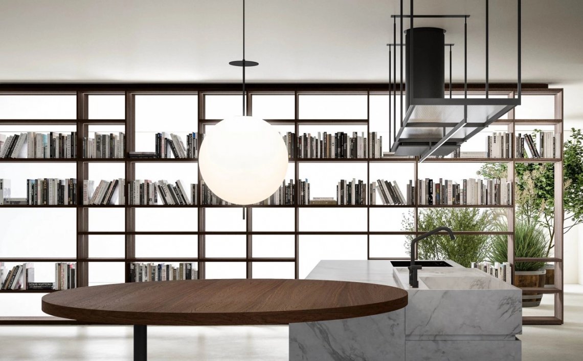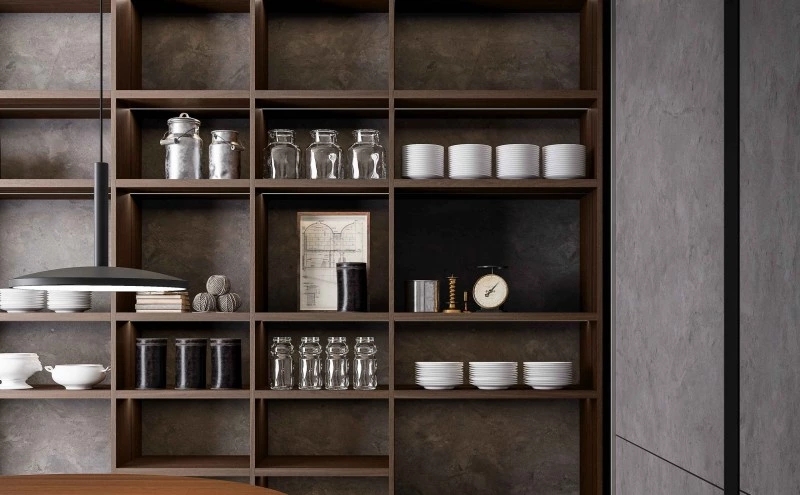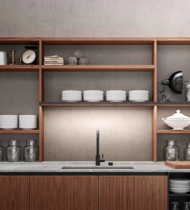 Modular system for open back wall-mounted or freestanding bookcases. It features the same vertical and horizontal thicknesses as Antibes, characterised by a great compositional flexibility, thanks to the various heights of the side panels and different widths of the shelves and base panels, while their thickness (side panels: 220 mm, shelves: 380 mm) and their depth (400 mm) do not change. The available finishes include matt lacquers and veneered wood species of the Boffi collections. The system allows to create floor-to-ceiling compositions also freestanding, which must necessarily be fixed to the ceiling. Antibes bookcase can be installed on kitchen worktop too, used as storage system. LED bar lightings complete the elegant architectural product. Design Piero Lissoni and C.R.S. Boffi.
