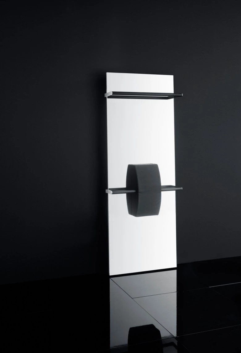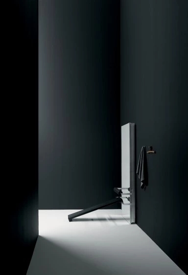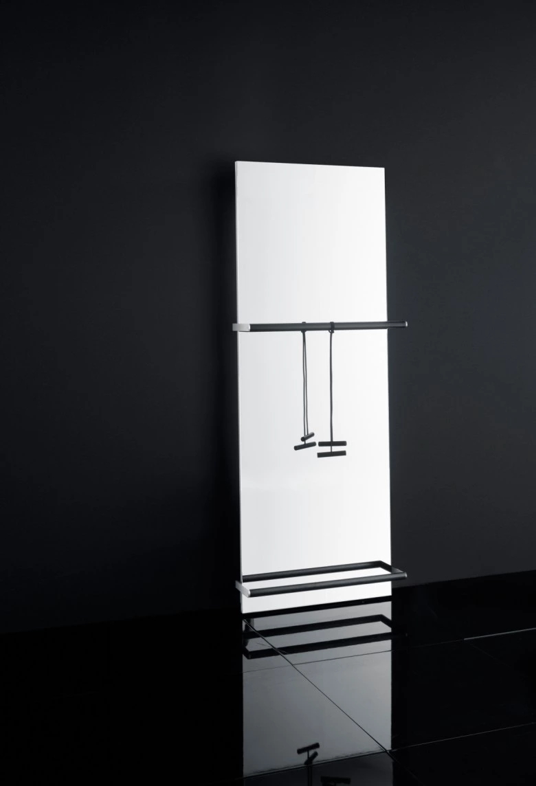 A wall-mounted fitness equipment characterised by small dimensions and a minimal design, conceived for the home environment and based on the precise need of incorporating all the typical functions of a Swedish wall bar system. Origine is made up of a front panel in mirror or Lasemat finish (Fenix Ntm? "soft touch" matt nanotechnology surface) supported by an aluminium structure and equipped with two frontal steel sliding bars, which are equipped with lock, covered in wood, matt black painted. This Swedish wall bar can be equipped with three types of tools: a 1400 mm long solid matt black painted wood bench, to be hooked to the front bars; a set of black rubber bands with matt black painted wooden grips; two pillows, one large curved and one small cylindrical covered in black technical material, to be inserted in the bars. Design Alessandro Andreucci, Christian Hoisl.