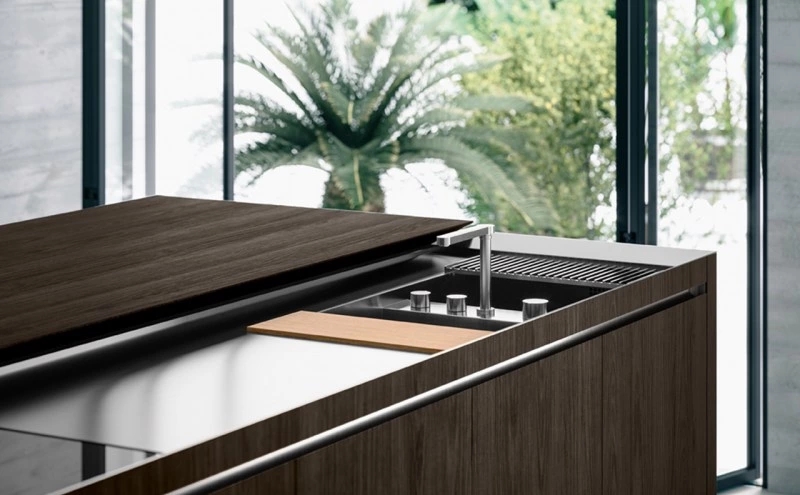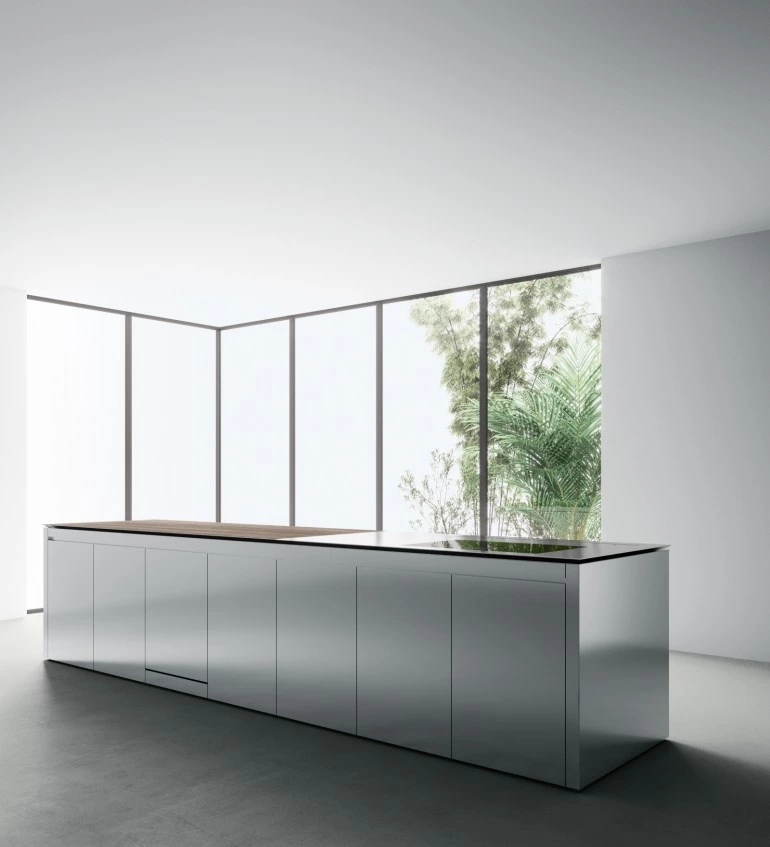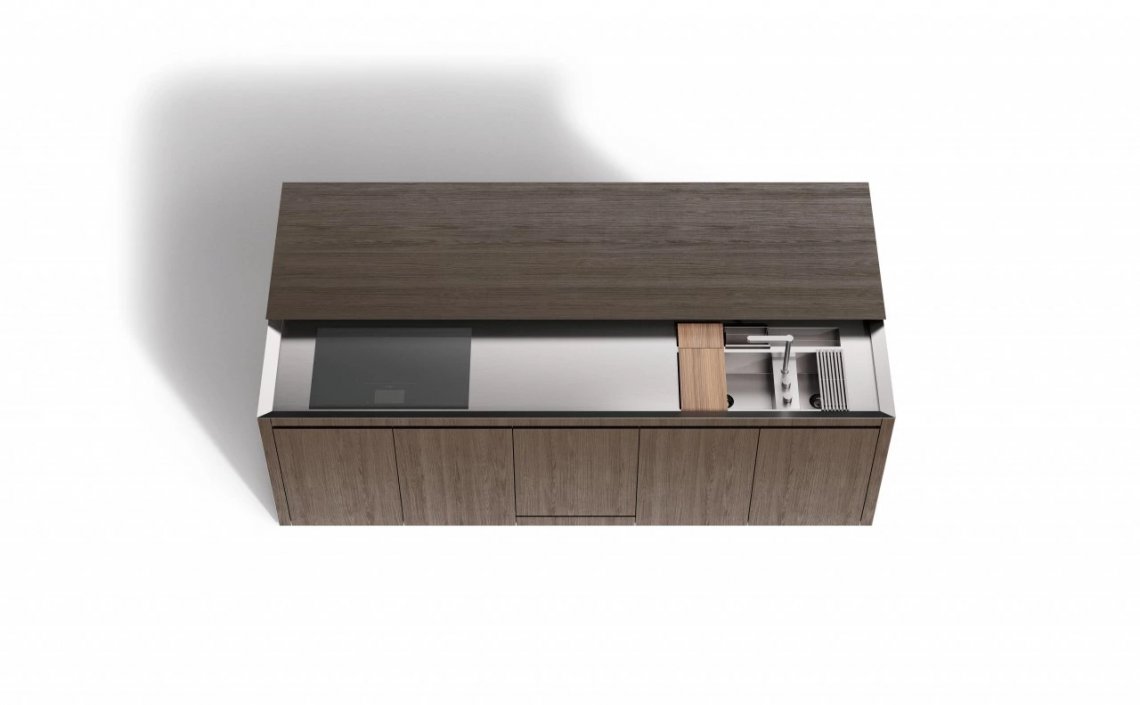 The Norbert Wangen’s kitchen cube design, presented in several shapes and dimensions, revolutionises the concept of the compact kitchen. K6 kitchen, together with K5, represents the development of the original concept of K2, K3 and K4 models: a single stand-alone monobloc that contains all the necessary elements for cooking, with a sliding top able to conceal the working area when not in use and to turn into a snack bar for serving and sharing food when open. The K6 is available in monobloc version or composed by two blocks, with a sliding worktop along the backside that conceals the fixed working surface below, becoming a protruding useful surface. The sliding worktop of the monobloc version covers totally the washing and cooking areas, while the version with two blocks features the cooking area with fixed surface, that is not covered by the sliding top as for the washing block. Thus, when the sliding worktop is closed, it is uniform and totally linear.