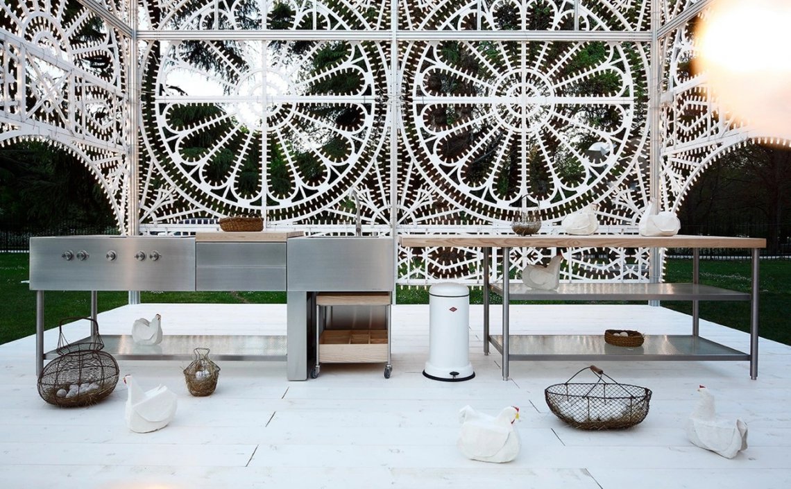 It is a minimalist kitchen consisting in an open-faced structure, specifically engineered for external use. The designer Piero Lissoni declared “Open is not a kitchen, it's much more. It's a machine, for preparing dinner, having a drink, listening to music, chatting with friends, cooking a meal or enjoying a good dish. The bodywork of this machine is in brushed stainless steel, natural woods and industrial-grade glass.” The core of Open is the AISI 316 stainless steel monobloc for cooking and washing. In the centre of the composition there is a removable chopping board in solid Iroko wood and below are housed two drawers. The block is supported by tubular steel frame with a shelf in transparent wired glass. The set is completed with a trolley on wheels to be placed under the sink, with a matt satin stainless steel structure, composed by 3 upper and 7 lower compartments in solid Iroko wood. The cooking and washing block can be combined with a large snack counter in solid Iroko, supported by a tubular steel structure equipped with two lower shelves in wired glass.