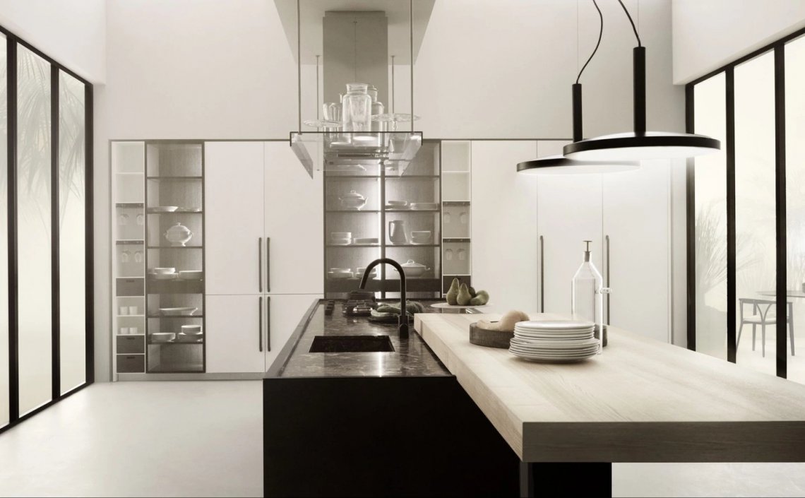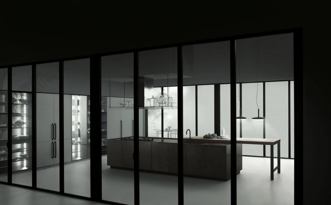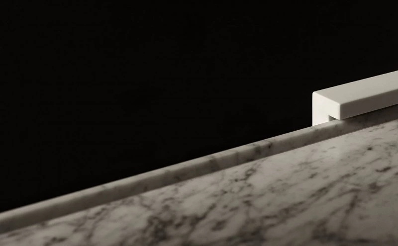 The K21 kitchen model originates from the innovative concept of the designer Norbert Wangen who, in the K series designed for Boffi, has transformed the concept of compact kitchen. The wall or peninsula/island modular base units have no handles: the door opening is guaranteed by the particular wrapping shape of front panels that hides, with close doors, the worktop thickness giving an extremely defined and monolithic appearance to the composition, highlighted by the worktop with basin effect. The front opening is allowed thanks to the upper protruding part (on the worktop) of the front itself. A middle handle-rail in extruded aluminium is set when drawers and heavy-duty drawers are used.