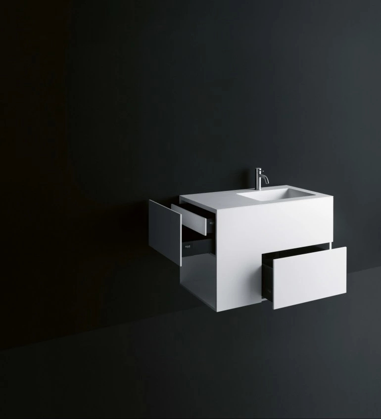 A compact, suspended washbasin base unit with integrated containing compartments, conceived as a solution to tight bathroom areas for both residential and commercial uses. The cabinet, made of MDF (Medium Density Fiberboard), is available in matt lacquered Silcover finish, in full colour range, completed by a top with washbasin in white Cristalplant?. A large front drawer, a side drawer with an additional internal drawer and an open compartment have been created inside the base unit for storage. The washbasin can be installed left or right hand.
