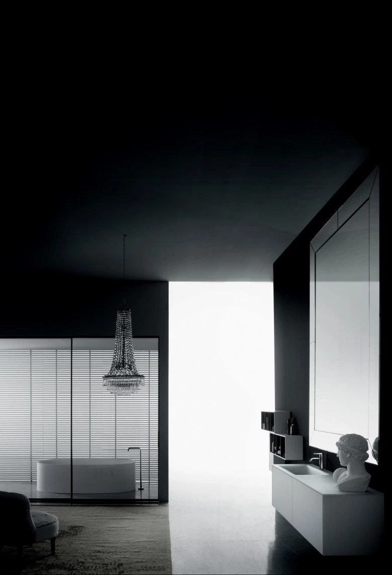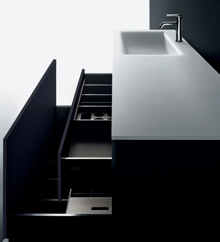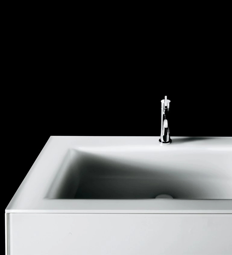 Wall hung, modular base units without handles, characterised by extreme formal and essential lines and doors in painted extralight frosted glass. The base units, available in two heights and four widths, have a single front equipped with the automatic Tip-On push-opening mechanism. In the taller version the base unit can contain an additional drawer. The tops are available in ex-tralight frosted or sanded painted glass, in Cristalplant?, in stone, marble and granite, in Dekton? and MDI composite. The compatible washbasins are top-mounted, built-in, under-mounted and moulded flush-mounted. The glass top version has an integrated thermo-formed washbasin with an exclu-sive and sophisticated design. Design Piero Lissoni e C.R.S. Boffi