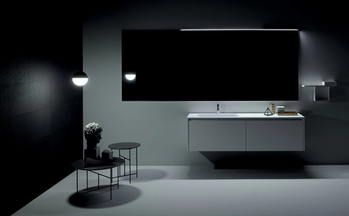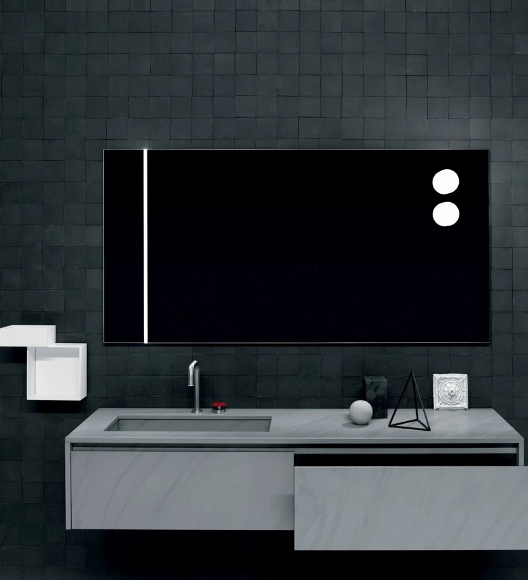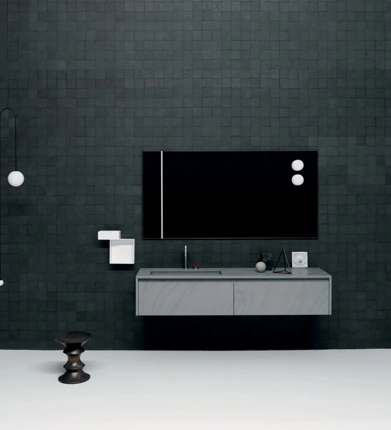 Wall hung, modular base units without handle, divided into monobloc elements and elements to be matched together, with end panels always in finish. The single front of the base units is pull-out and opens drawer units with internal compartments and drawers. The tops have a specific recessed finished band on the bottom, which create a handle-rail effect. This detail, in combination with the bevelled edge of the doors, offer the grip needed to open the door fronts. The band is in the same finish as the top: Corian?, stone, marble, granite, Dekton?, Cristalplant?. All types of washbasins are compatible with Xila bathroom units, which are available in two heights and five widths, in lacquer and wood finishes, as well as in Corian?. Design C.R.S. Boffi.