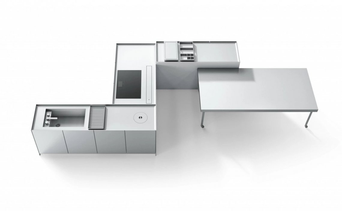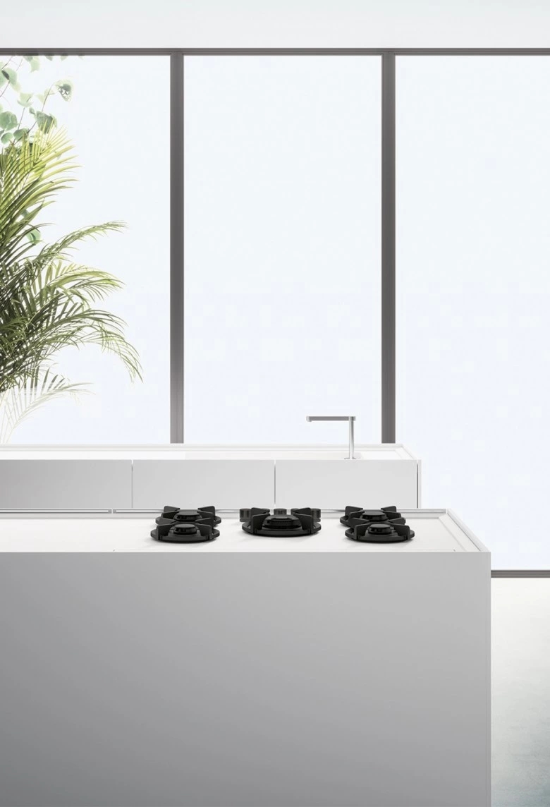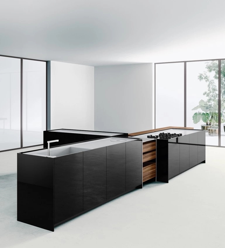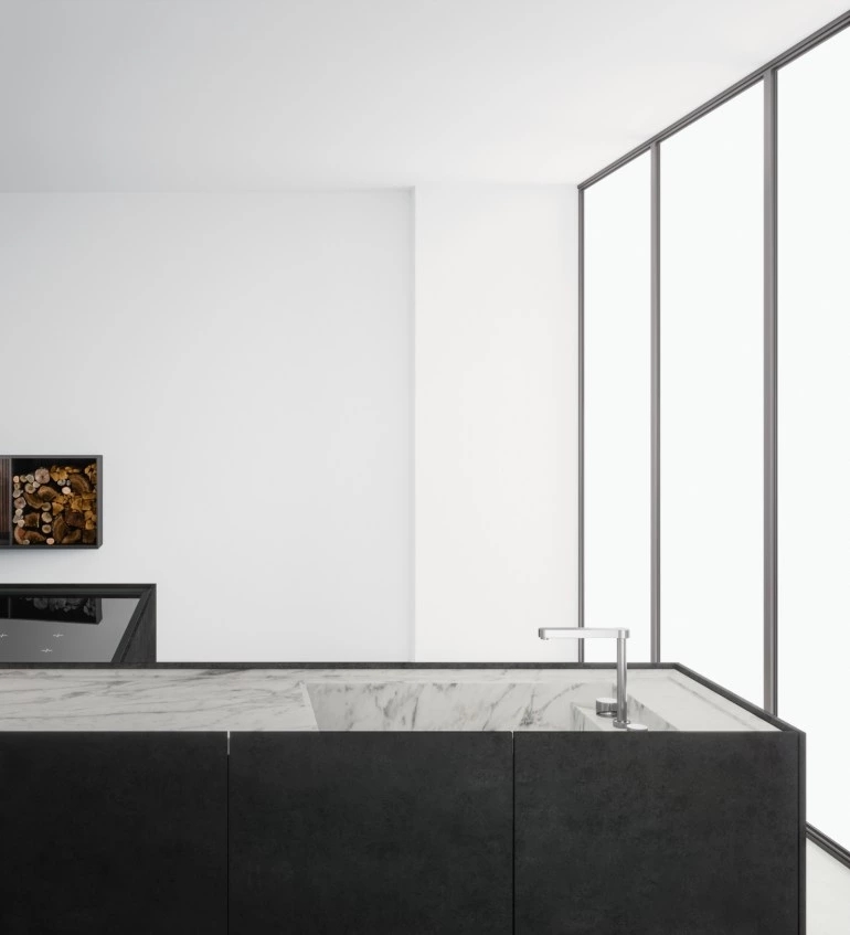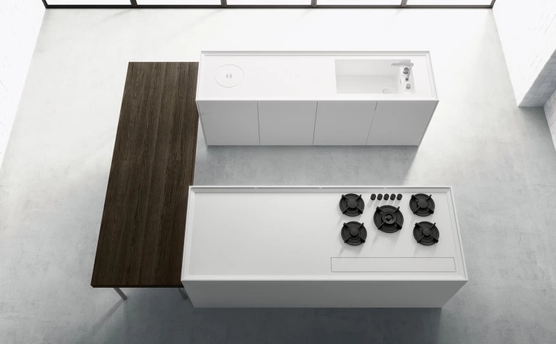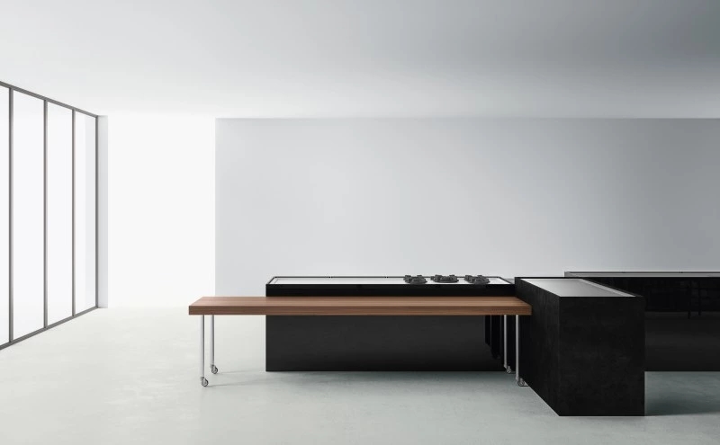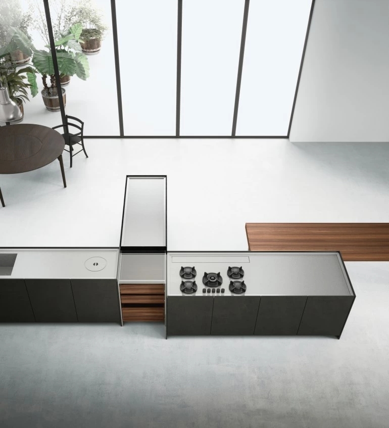The Combine programme blends the compact kitchen to the traditional kitchen island, offering functional monoblocs with pull-out doors. Each bloc has a specific use: two are technician areas – one for cooking and one for washing – and one suits for preparation. This setting allows great freedom of composition, whether linear, angular or zigzag. Combine kitchen can be completed with protruding or extractable tables, thus integrating the dining area into the kitchen work area. The extremely light and thin door profiles are opened by gripping the upper part of the door, which protrudes from the bevelled worktop, internally tilt to its surface. They enhance the formal and compact design of the linear and monolithic blocks. The hob is available in glass ceramic with induction stoves and an area suitable for wireless charging. A flush-mounted integrated downdraft hood completes the worktop. A wide range of materials are proposed for worktops, such as the extremely resistant Durinox? Gunmetal micro-sandblasted steel, a product derived from aerospace technology: the surface is scratch-resistant and stain-resistant, matt and velvety to the touch. Design Piero Lissoni.