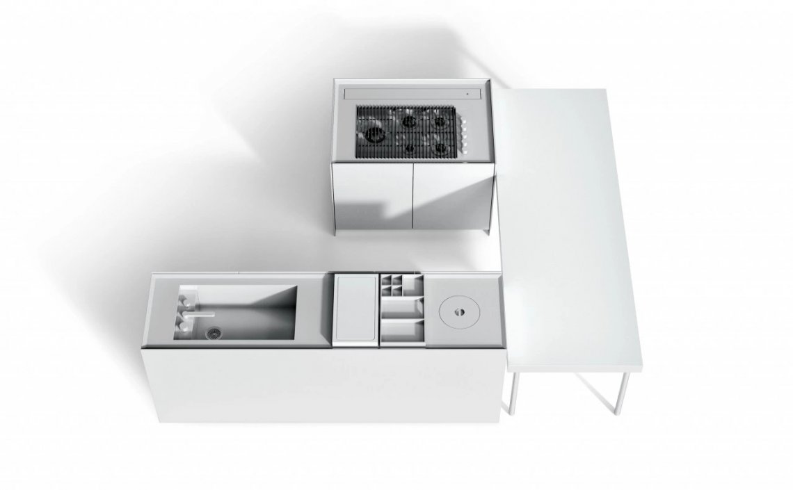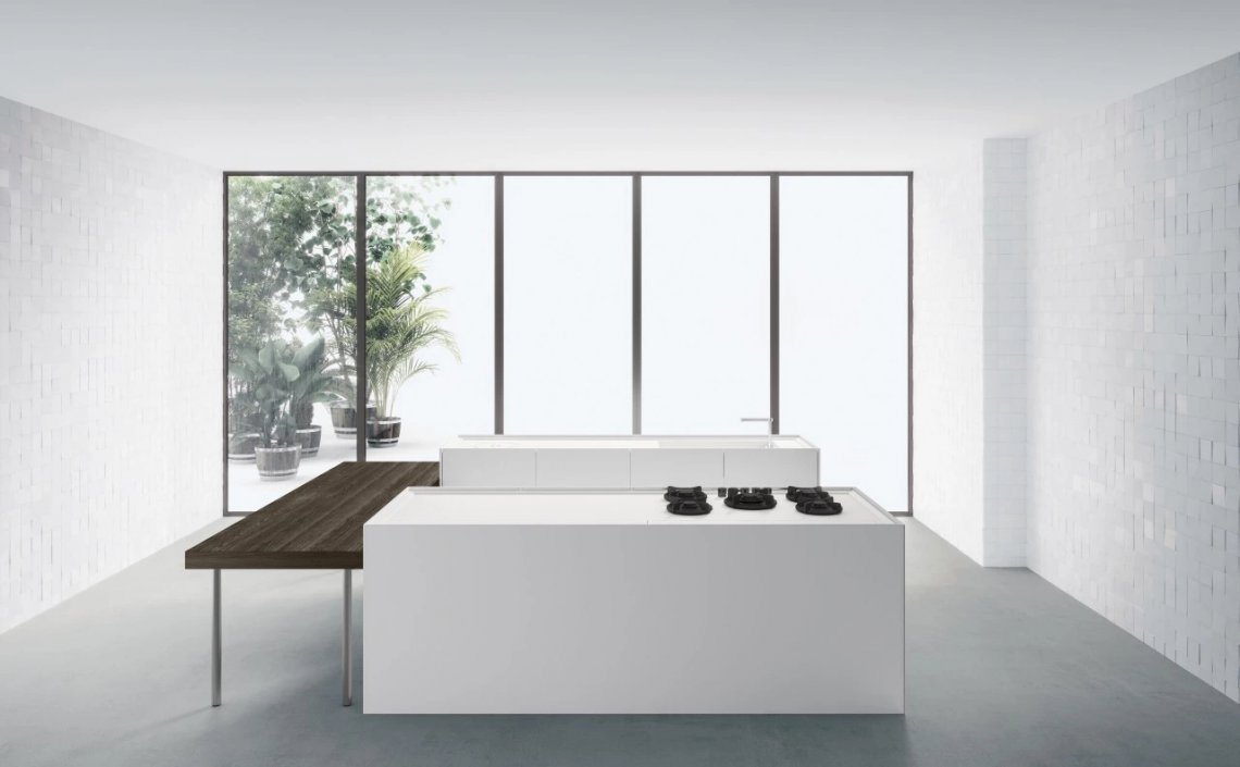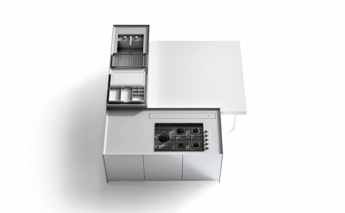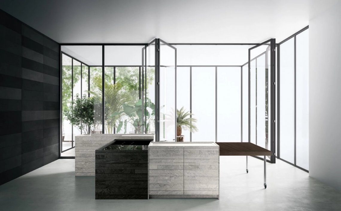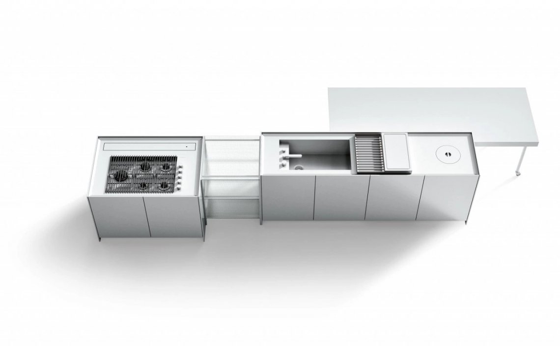 The Combine programme blends the compact kitchen to the traditional kitchen island, offering functional monoblocs with pull-out doors. Each bloc has a specific use: two are technician areas – one for cooking and one for washing – and one suits for preparation. This setting allows great freedom of composition, whether linear, angular or zigzag. Combine kitchen can be completed with protruding or extractable tables, thus integrating the dining area into the kitchen work area. The extremely light and thin door profiles are opened by gripping the upper part of the door, which protrudes from the bevelled worktop, internally tilt to its surface. They enhance the formal and compact design of the linear and monolithic blocks. The hob is available in glass ceramic with induction stoves and an area suitable for wireless charging. A flush-mounted integrated downdraft hood completes the worktop. A wide range of materials are proposed for worktops, such as the extremely resistant Durinox? Gunmetal micro-sandblasted steel, a product derived from aerospace technology: the surface is scratch-resistant and stain-resistant, matt and velvety to the touch. Design Piero Lissoni.