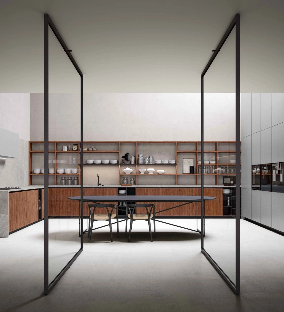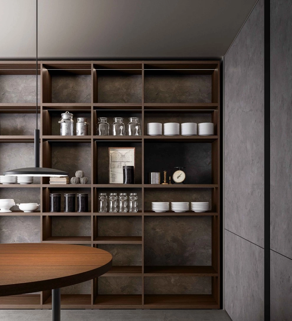 New shelving -bookcase system, characterised by same vertical and horizontal thicknesses as Antibes and by flexible shelves, available in different width and positioned at different height, both in veneered wood and matt lacquer