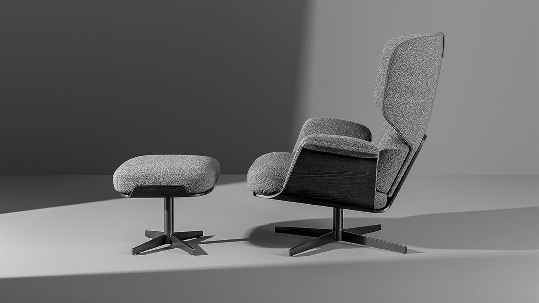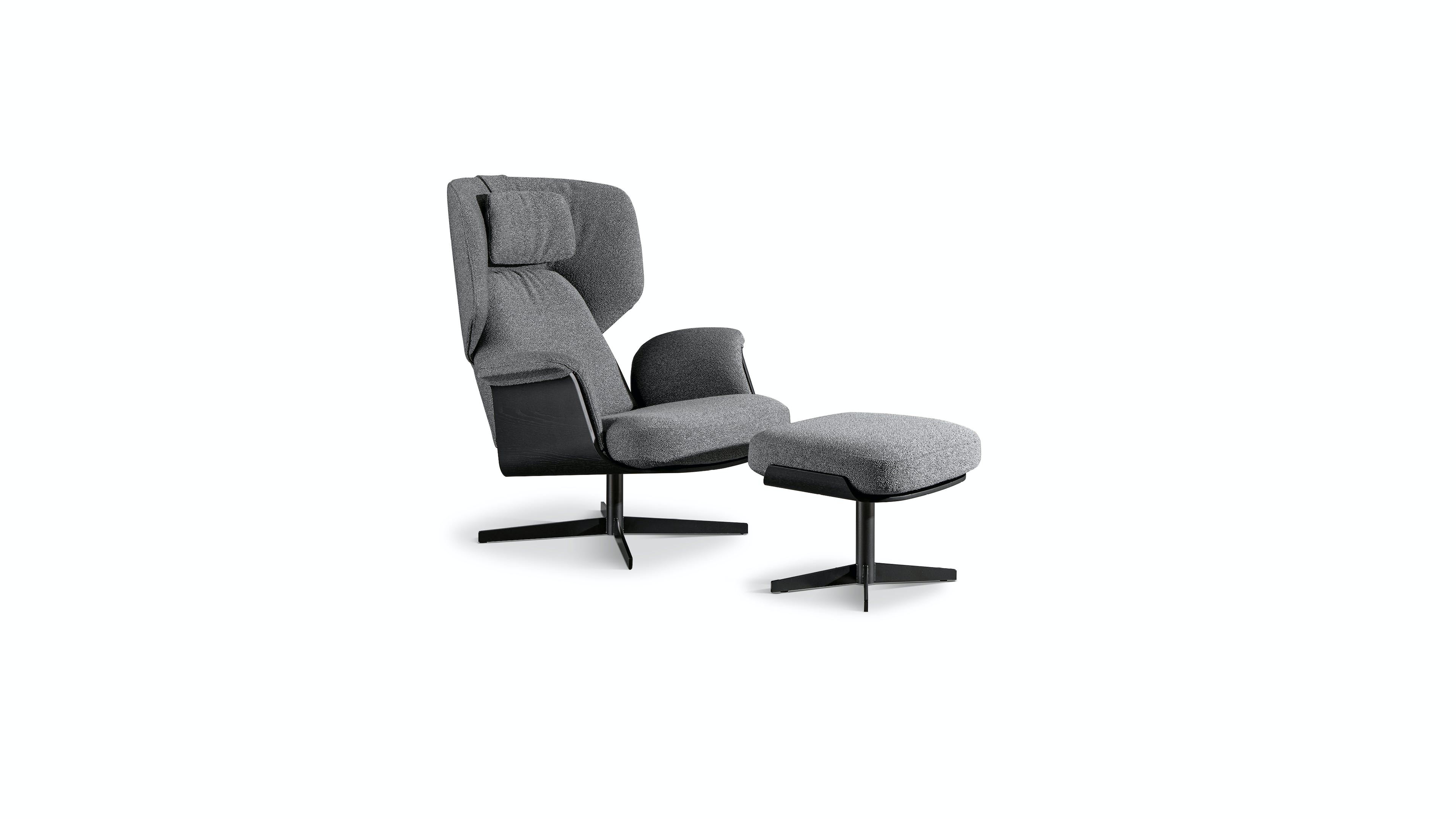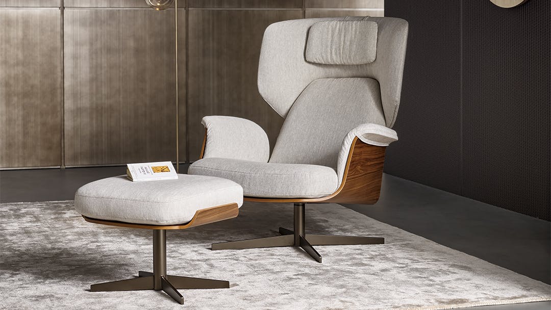 The Olos bergère armchair combined with the Olos footstool complements the Olos collection helping to make it both coordinated and harmonious. The new bergère design armchair offers considerable levels of relaxation, characterized by contours that indicate a lifestyle that is elegant, rigorous, serene and casual all at the same time, presenting a reinterpretation of mid-century modern design that reminds us of the authenticity of curved lamellar woodworking. Like a protective shell, the gentle smoothness of the curves of the supporting wooden frame combines with the sinuous roundness of the padding, making the generous level of comfort on offer evident at first sight, welcoming you enticingly with its essential forms.