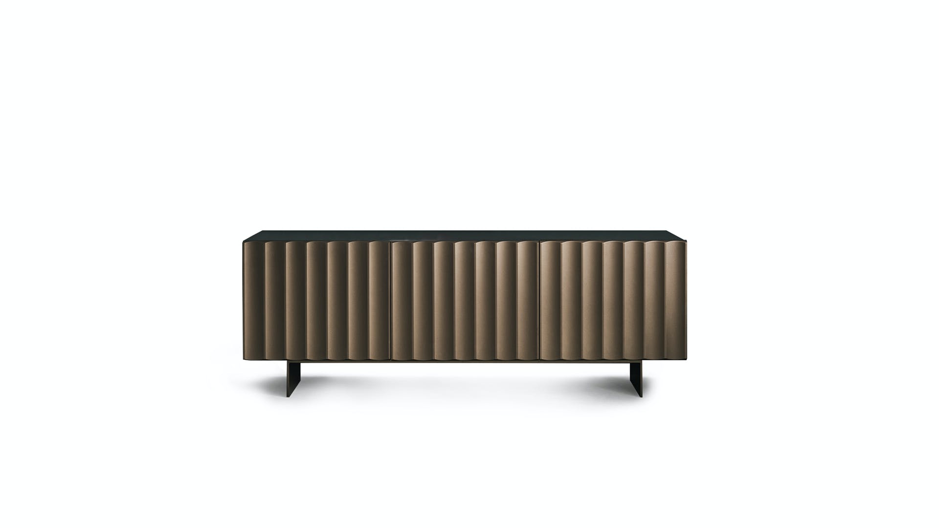 The signature feature of the Dorian contemporary sideboard is the wide vertical groove highlighted in its doors. The sense of movement thus created by the doors of the Dorian sideboard breaks up the linearity of the wall on which it rests, thus adding visual appeal to the intrinsic function of the sideboard. The doors and frame of this sideboard are made of wood, a material which adds elegance to the overall look, painted in white, bronze or lead finishes. The base is available in the version with two feet for a lighter visual effect or in the version with a plinth for a more compact look.