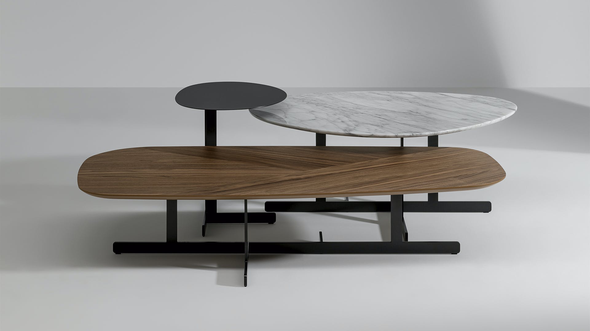 To create these sets of modern nesting coffee tables, architect Mauro Lipparini focused on a minimalist design and combined the bold geometric shape of the metal support with the curved contours of the tops, available in a variety of finishes, creating a formal contrast expressed with the utmost lightness. They are perfect either positioned in the middle of the room or to the side of the sofa.