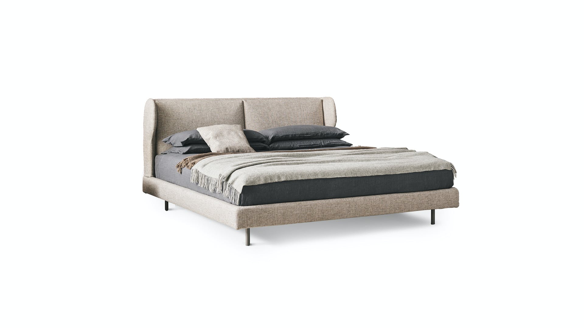 The headboard is the true visual focal point of the River double bed, soft and suggestive: the side “wings”, continuation of the front section, are a decorative element and quite cosy. It has great customisation potential, thanks to the choice of numerous fully removable covers available in fabric, leather or eco-leather. A contemporary bed which is perfectly at ease in environments with different aesthetic characteristics and which feels “at home” both in traditional furnishing solutions and when combined with contemporary design elements. It is the details that characterise a piece of furniture such as the River modern bed: the elegant quality of the workmanship, the materials used and the range of ?nishes available. The aesthetic point of reference is harmony: the pleasing elegance of the ornamental lines of the headboard is matched by the sobriety of the bed frame and the lightness of the metal feet, available in different colours and ?nishes.