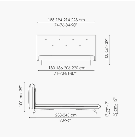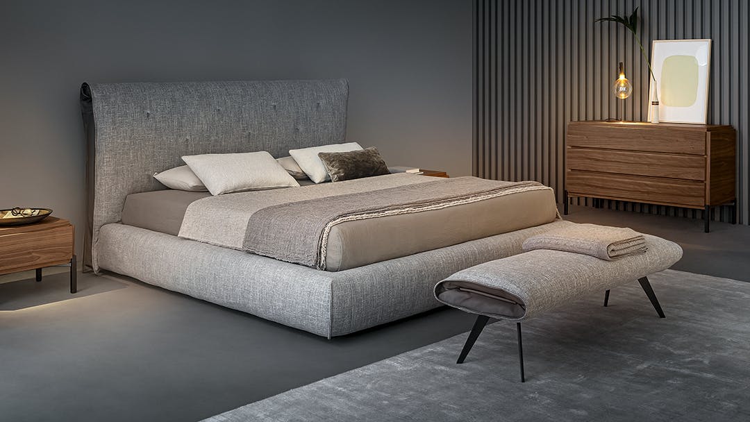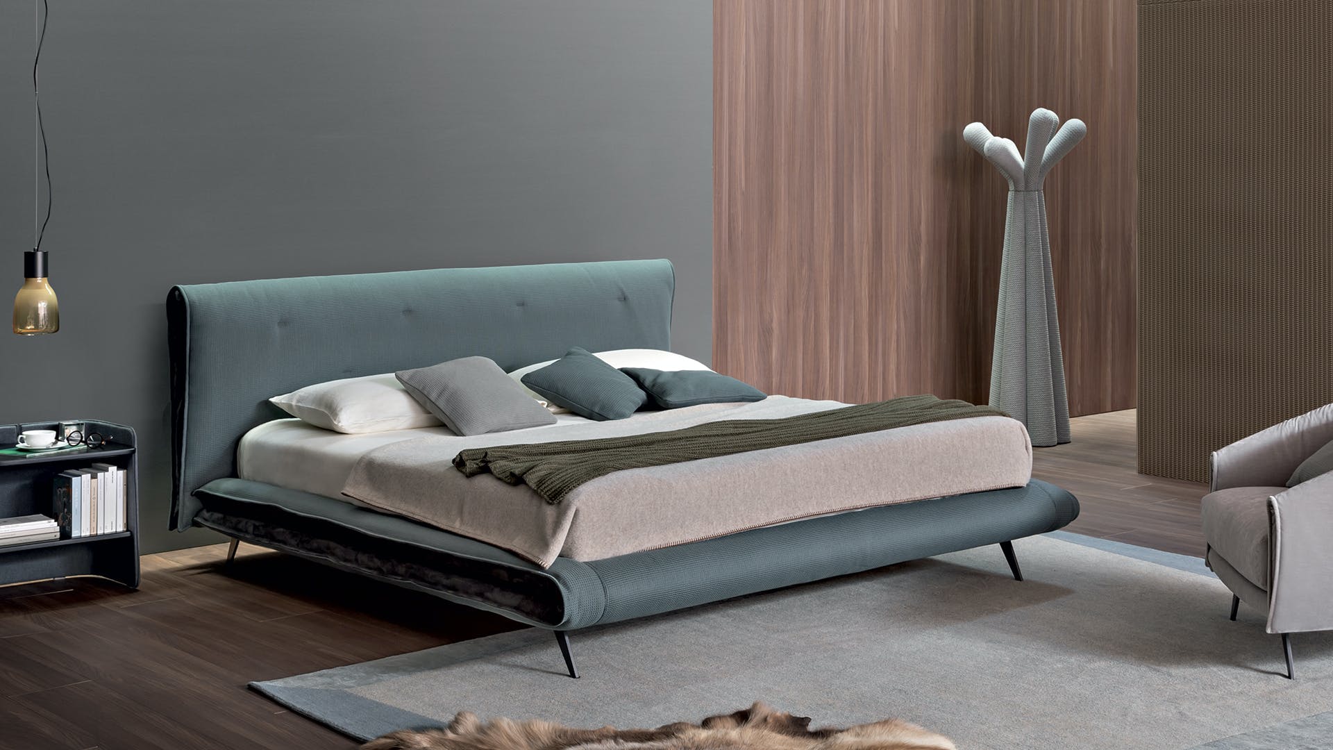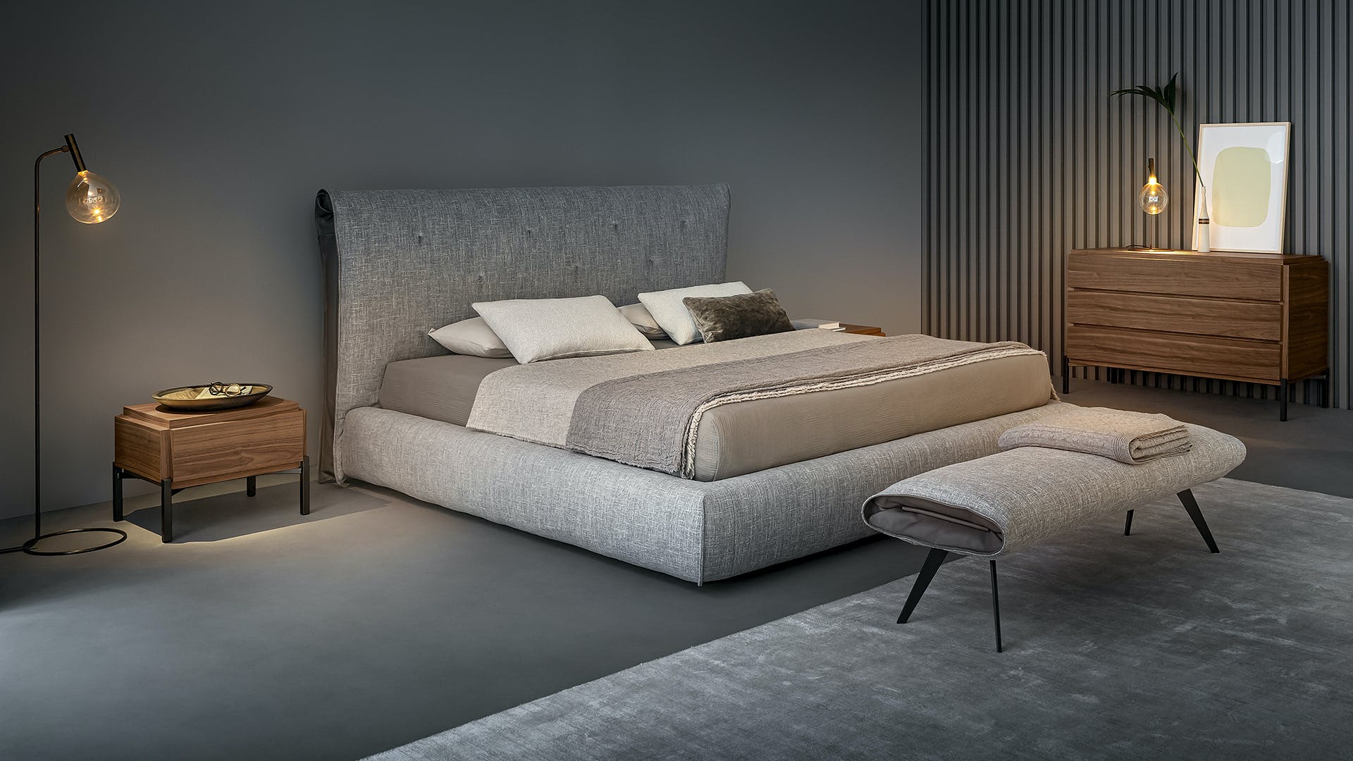 The high upholstered headboard and bed frame are the distinctive elements of the Saddle bed: folded over themselves, they bring to mind the form of a saddle, which gives the name to this family. The characteristic features of the bed’s headboard are the quilting and the valuable leather inserts which are also found in the bed frame. This allows a singular interplay of materials and combinations that create an appealing optical effect and emphasize the extreme attention to detail. The figure of the bed is made even lighter by the feet in painted metal available in numerous finishes. Alternatively, it is possible to choose among other different versions: the Saddle bed hi with an even higher headboard, the Saddle bed plus with a thicker bed frame and low feet, and the Saddle bed hi plus, which combines these two variants. The modern high headboard beds are also available with storage (Saddle bed open and Saddle bed hi open) and the collection is completed by the Saddle bench with its shaped legs.