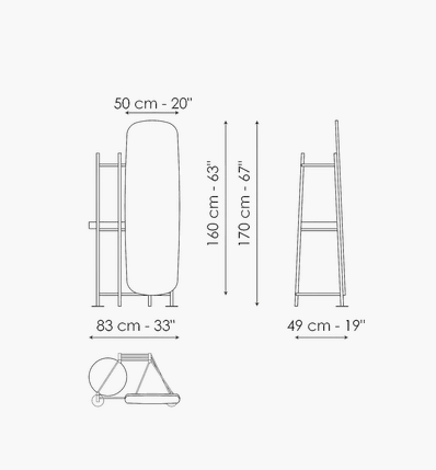 Perfect in its dynamic as a holder, every detail of the Salomé clothes valet stand contributes to the overall balance. Its design consists of delicate geometric shapes marked by precise vertical signs in which the luminous patterns of the transparent globe seem to dance with mirrored re?ections. Lights, lines and materials as fundamental features of an object destined to perform a daily service that becomes an emblem of an intimate relationship with the sleeping area: the beauty of the Salomé bedroom valet stand lies in the charm of the harmony between the forms and the intensity of its presence, a strongly scenographic design. The Salomé valet stand comes with a metal frame and tray in different finishes. A version with lampshade is also available.
