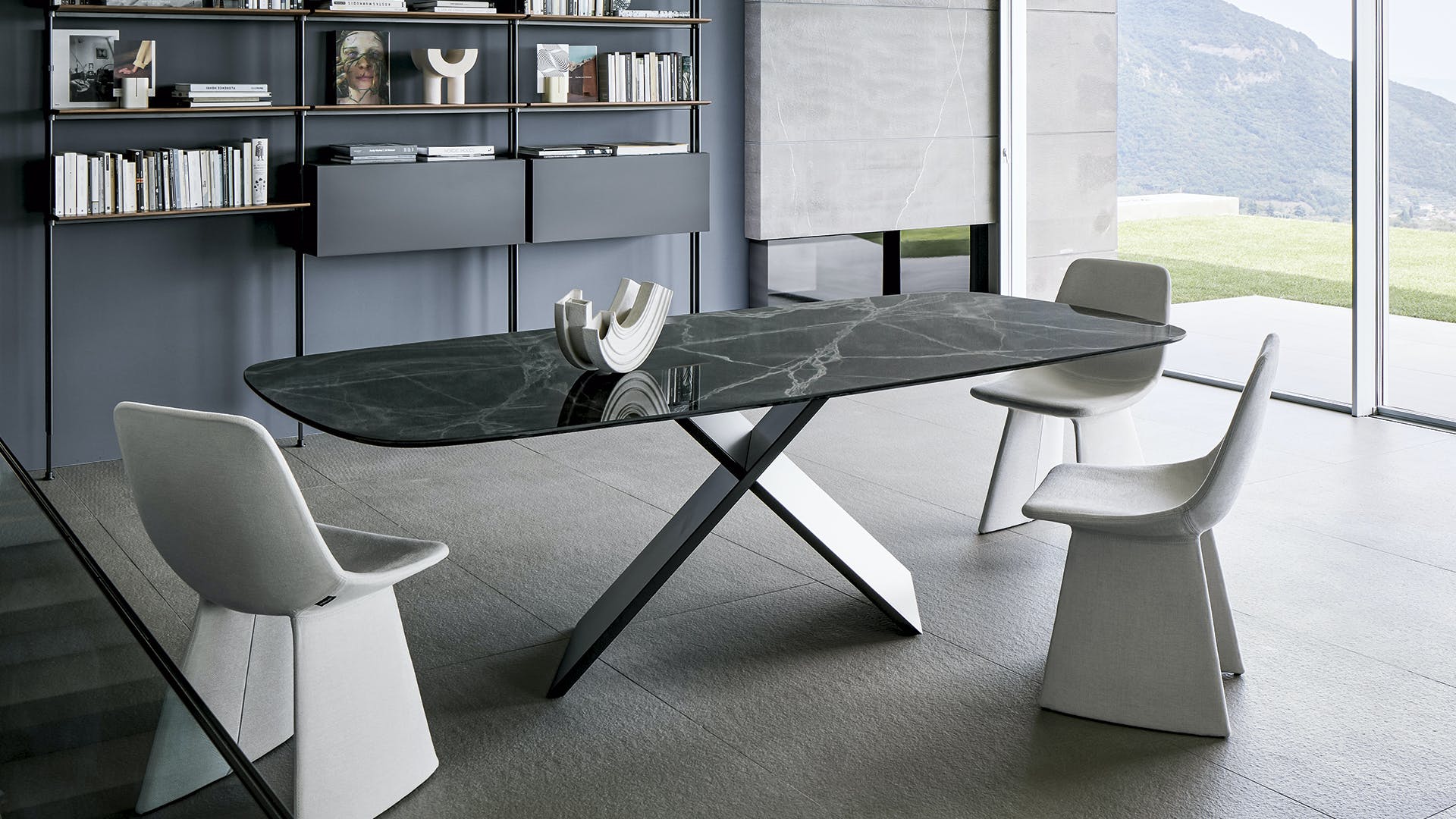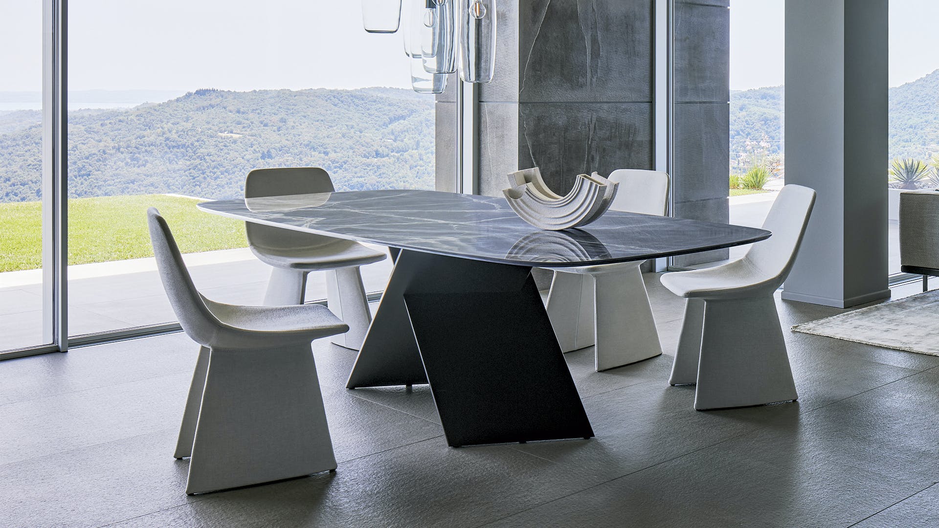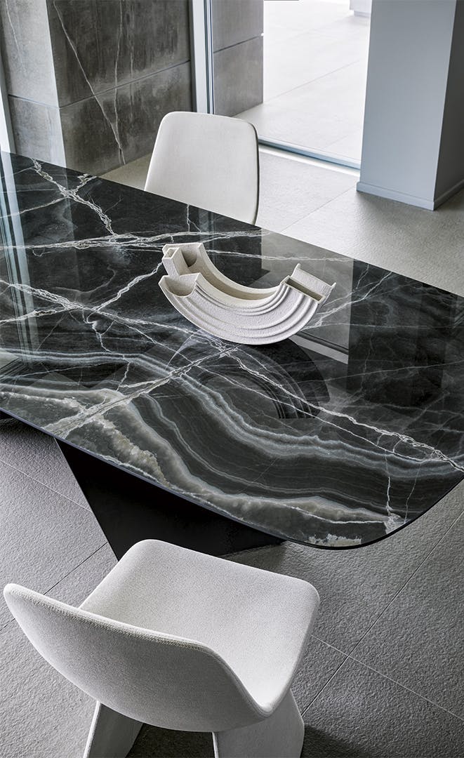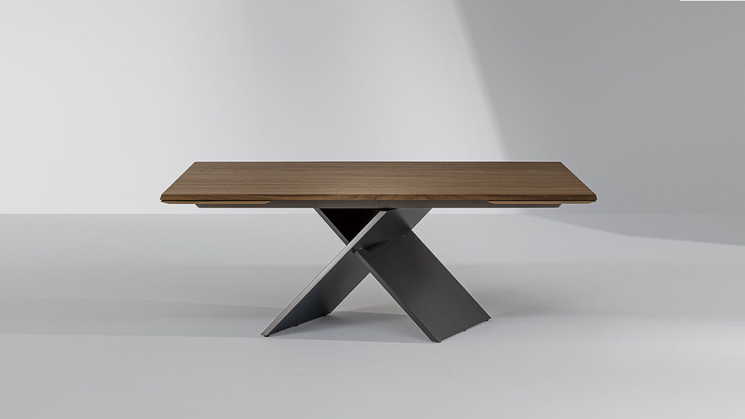 Geometric essentiality and linearity are the choices of a design language for the AX rectangular extendable dining table based on simplicity but also solidity, underlined by the sizeable base. The appeal of the material contrast between the top and the legs makes any decoration almost superfluous, enhancing the purity of the design and Bonaldo’s handcrafted excellence. The juxtaposition of very different materials underlines the contemporary feel of the design: the legs are offered in painted metal of numerous colours or burnished finish; the top, both in the fixed and extendable versions, is available in wood or ceramic. A console with the same name (AX Console) is also available for creating rooms with a coordinated style.